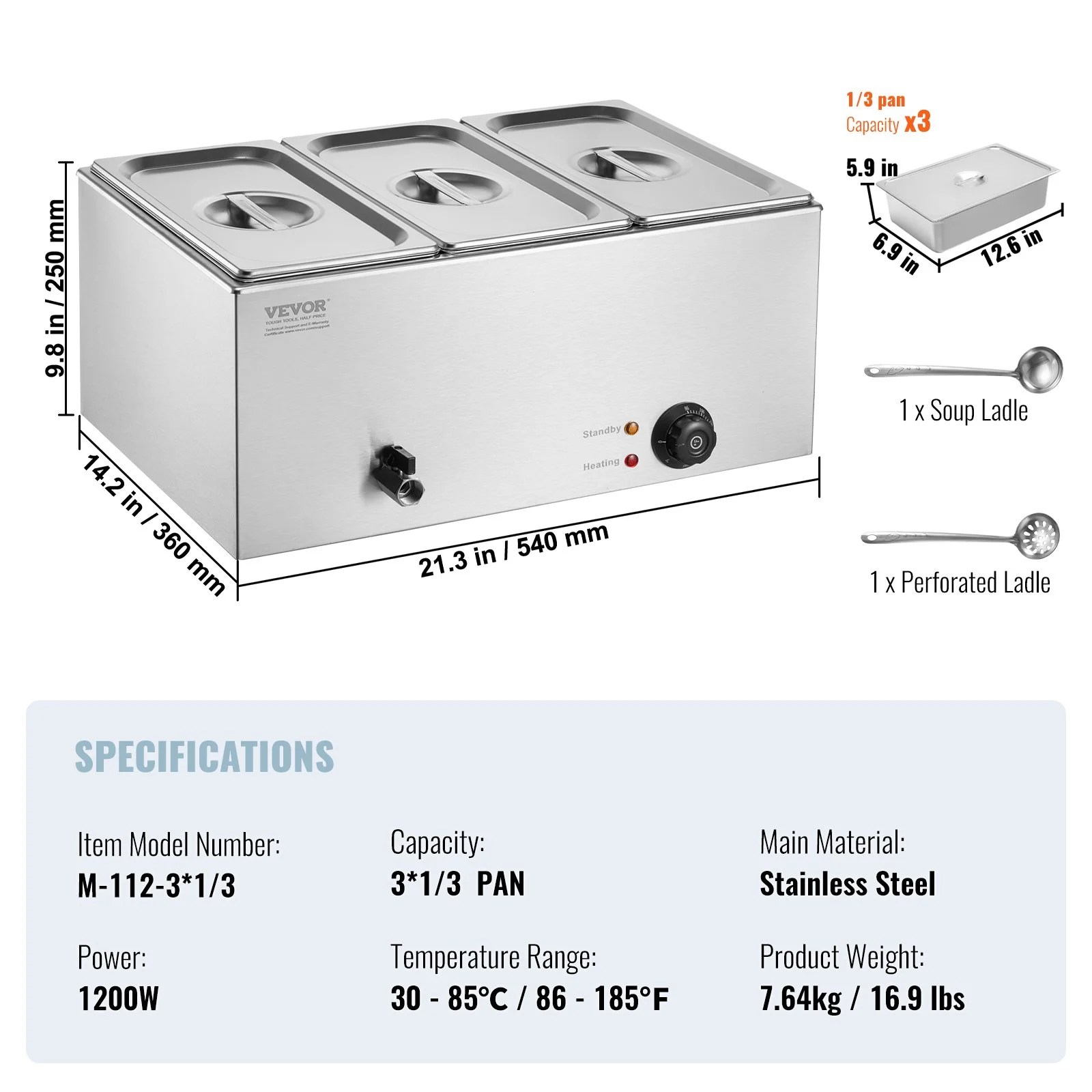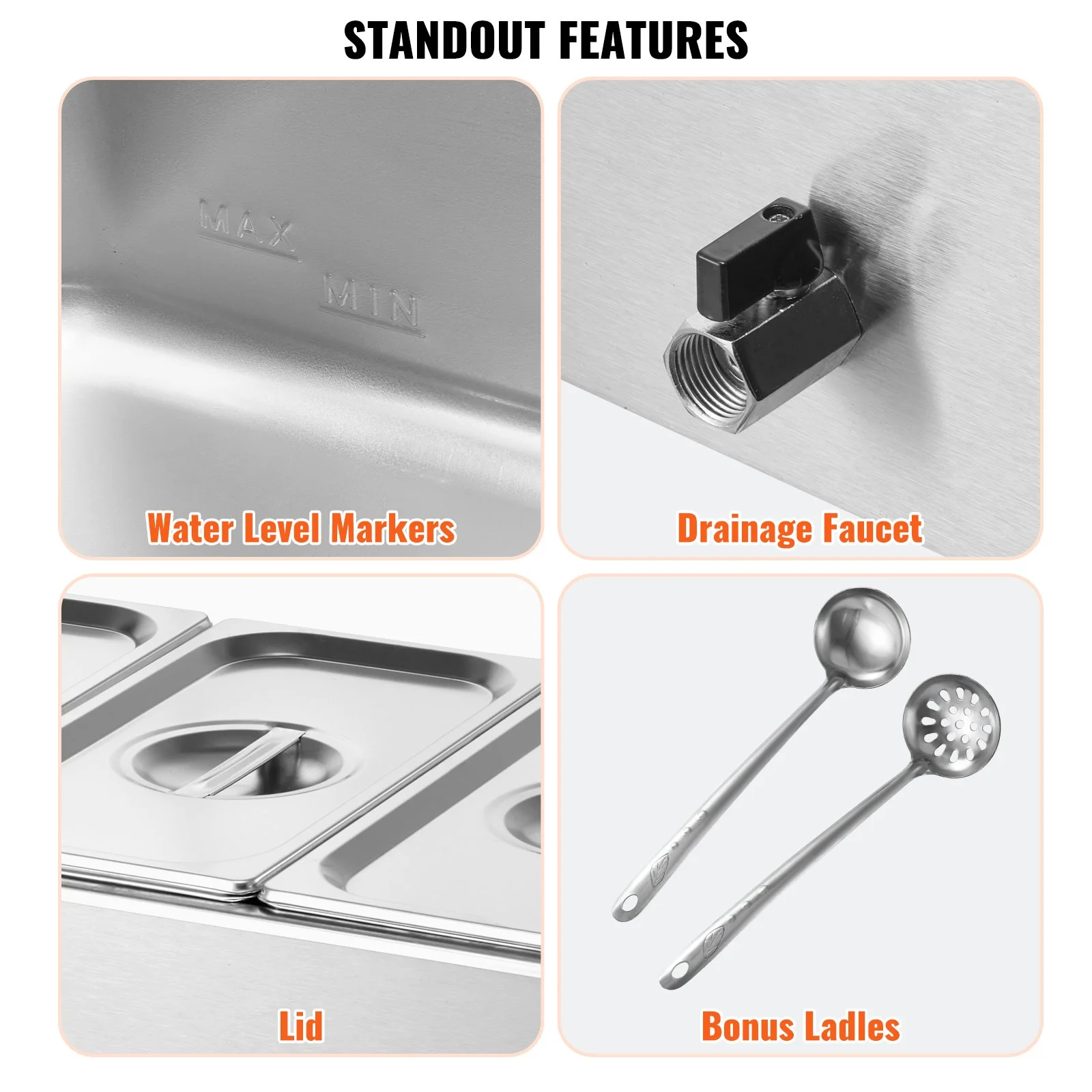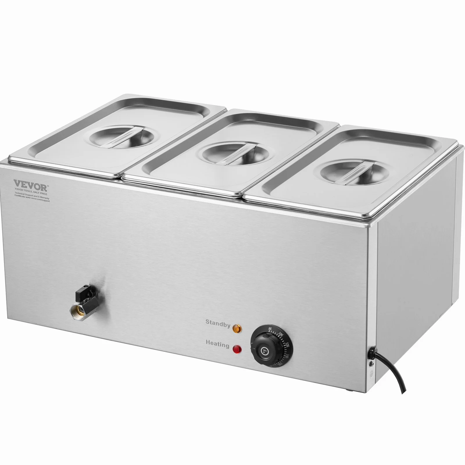 Our commercial food warmer comes with 17.4qt / 16.5L food pans (3*1/3) accompanied by their respective lids, allowing you to serve different dishes simultaneously. Feel free to change up your menu from soups and sauces to stew, or even nacho cheese and chocolate.