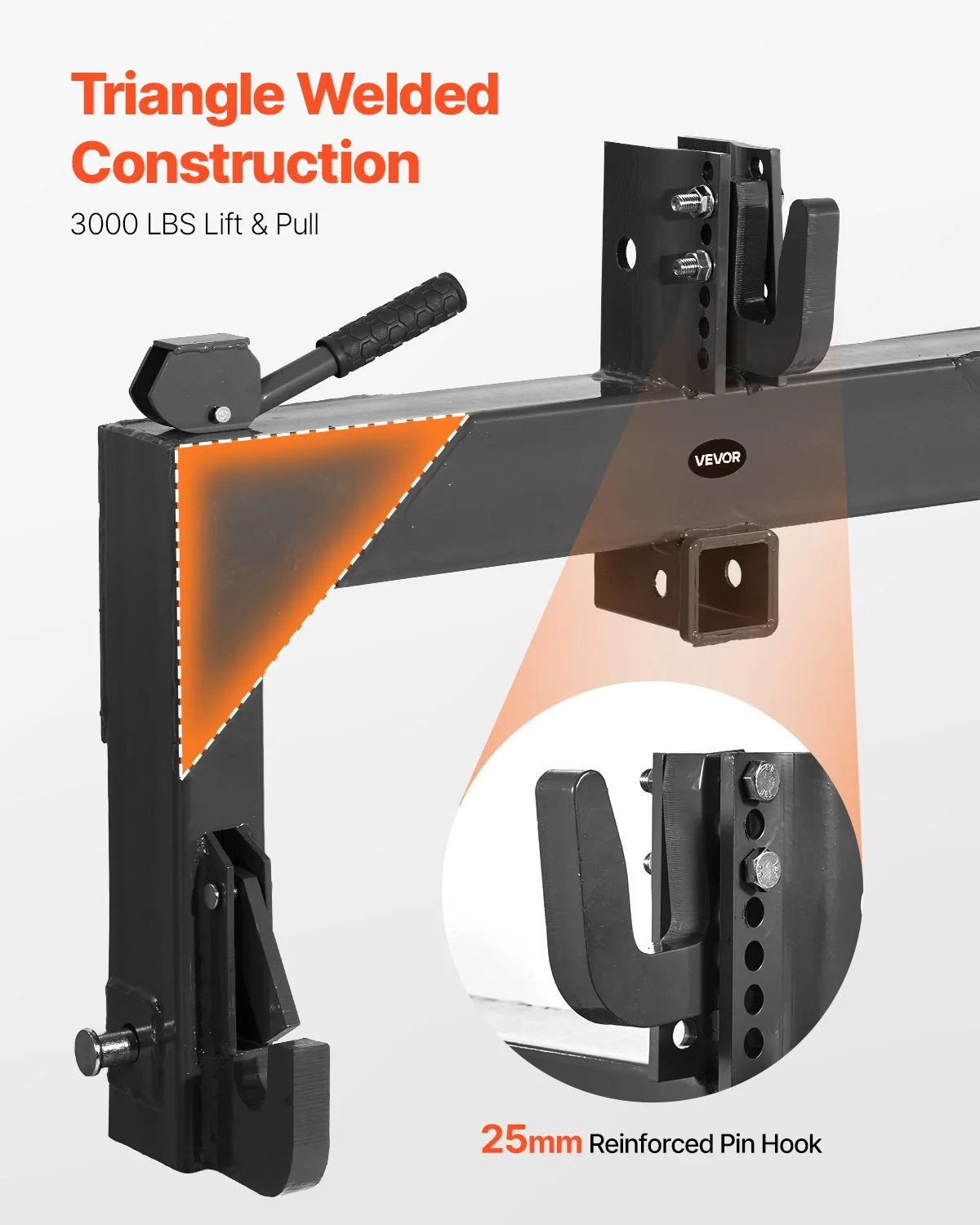 Our tractor hitch with welded triangular steel plates on both sides provide added stability. The thickened connection points and high-quality aluminum pins can withstand heavy use and are resistant to cracking. Lifting capacity of up to 3000 lbs ensures safe and stable operation.