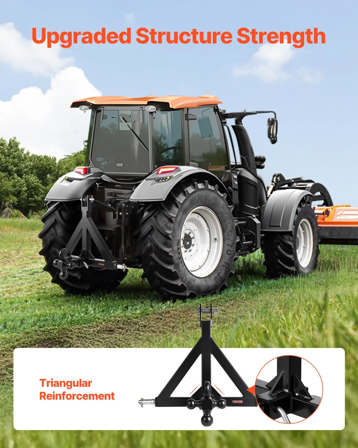 Featuring a robust triangular structure and 0.15 in / 3.75 mm wall thick steel, the 3 point hitch attachment with high-strength welding ensures stability and resistance to breakage or deformation. It provides reliable support for heavy-duty farming tasks without fail.