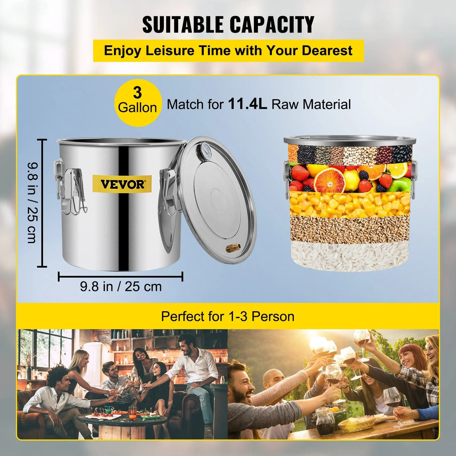 This alcohol still provides you with a fermentation capacity of 3 gallons. Boiler barrel: 9.8" x 9.8" (25 x 25 cm), condenser: 7.9" x 4.3" (20 x 11 cm), thumper keg: 7" x 4" (18 x 10 cm), which can ferment up to 11.4 liters of raw materials. Perfect for family-together parties. All parts are made of food-grade materials, including silicone, stainless steel, and copper.