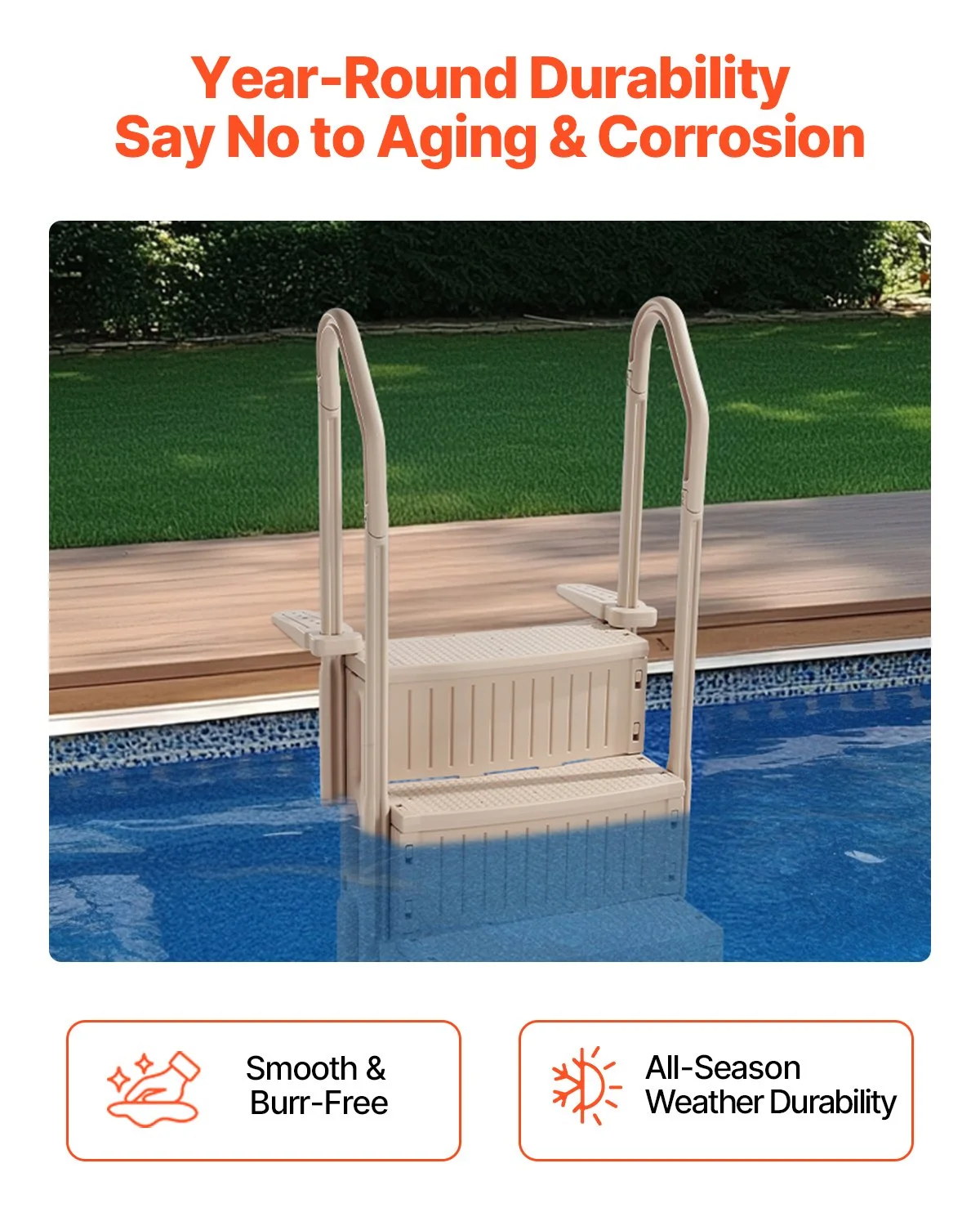 With a weight capacity of up to 400 lbs, this pool stair is the first choice for both children and adults. The thickened step boards are designed with non-slip textured surfaces to ensure security with every step.