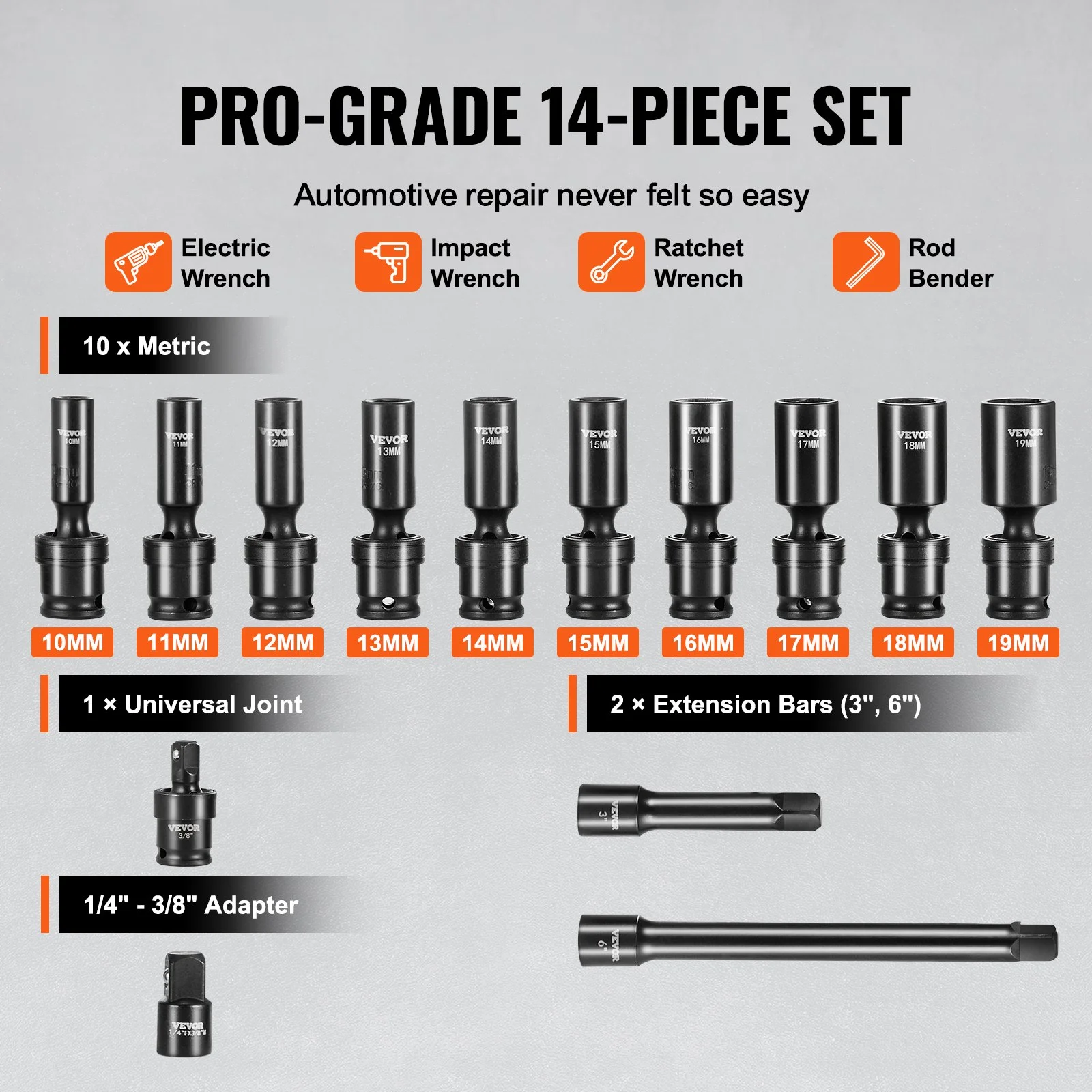This comprehensive set includes 10pcs metric deep impact sockets: 10mm, 11mm, 12mm, 13mm, 14mm, 15mm, 16mm, 17mm, 18mm, 19mm. It also includes 2 extension bars (3", 6"), 1/4" - 3/8" adapter and a universal joint.