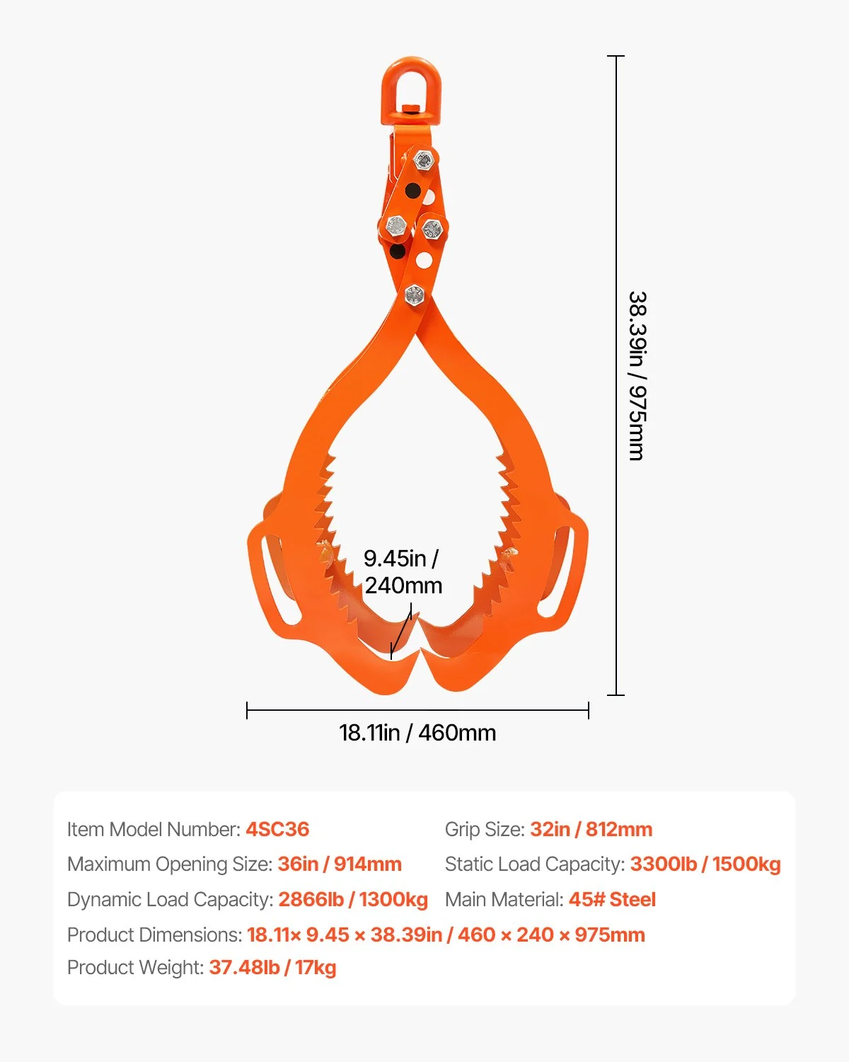 The 36-inch log tongs feature an adjustable opening from 32 to 36 inches, providing a secure grip for various object sizes. This flexibility enhances efficiency and ensures stability during operation.