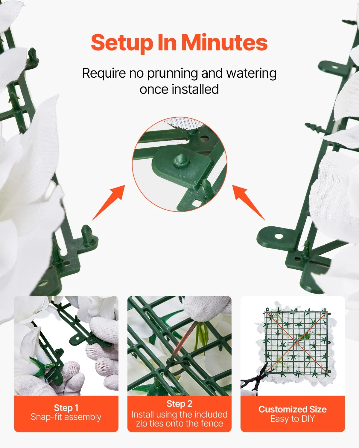 The interlocking snap system allows you to assemble your plant wall quickly and securely. Additionally, we include 200 complimentary zip ties to help you attach the panels firmly to fences or other surfaces. The plant wall is flexible and easily customizable, allowing you to cut and shape it to meet your specific DIY needs