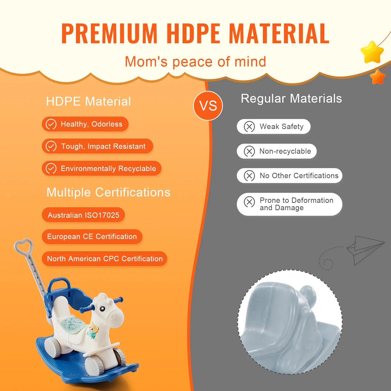 Safety comes first. Made from high-density polyethylene (HDPE), this baby rocking horse is sturdy, durable, and non-toxic, ensuring it's safe even if your little one decides to take a bite. The strong structure can easily support up to 80 lbs (36 kg) and has passed multiple certifications, providing a stable play environment for your child.