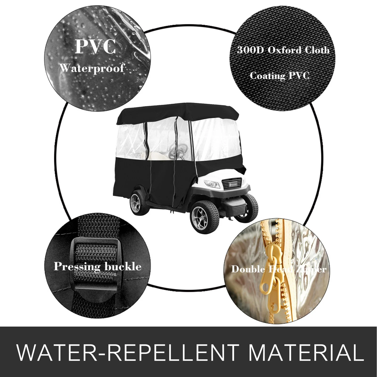 PREMIUM MATERIAL- Constructed of 300D Oxford cloth with PVC coating, PVC window, and #10 Resin Zipper, it is durable, water-resistant, ultraviolet-proof, against wind and rain. Can keep the cart inside dry and clean, keep people inside warm. Let you enjoy golf with no worry.