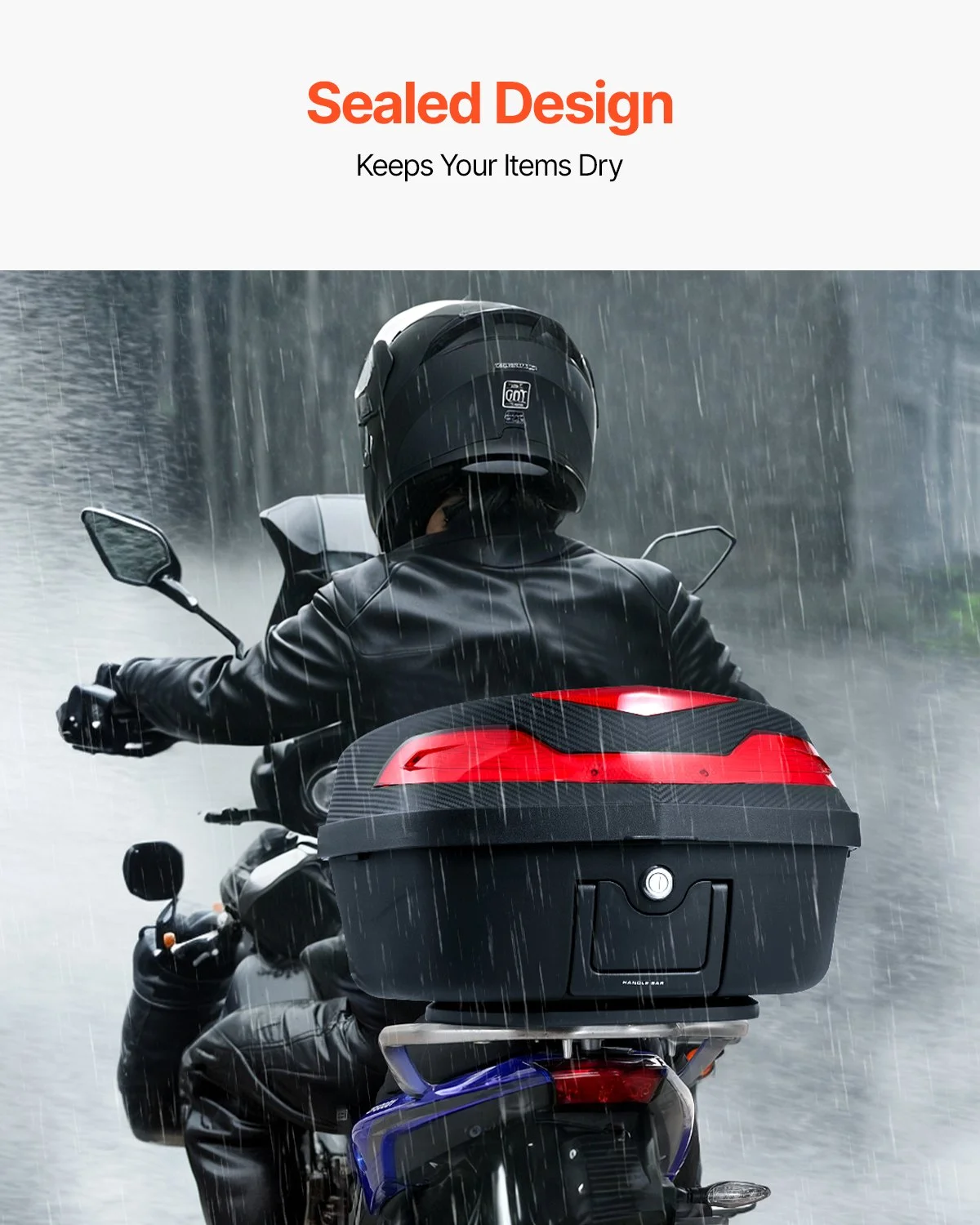 Offering 48L of space, this tailbox can store a full helmet, daily essentials (such as shoes, large motorcycle jacket), medium-sized backpack, gloves, umbrella, and rain gear, making it ideal for short trips. Equipped with a secure zinc alloy lock to guard your belongings from theft.