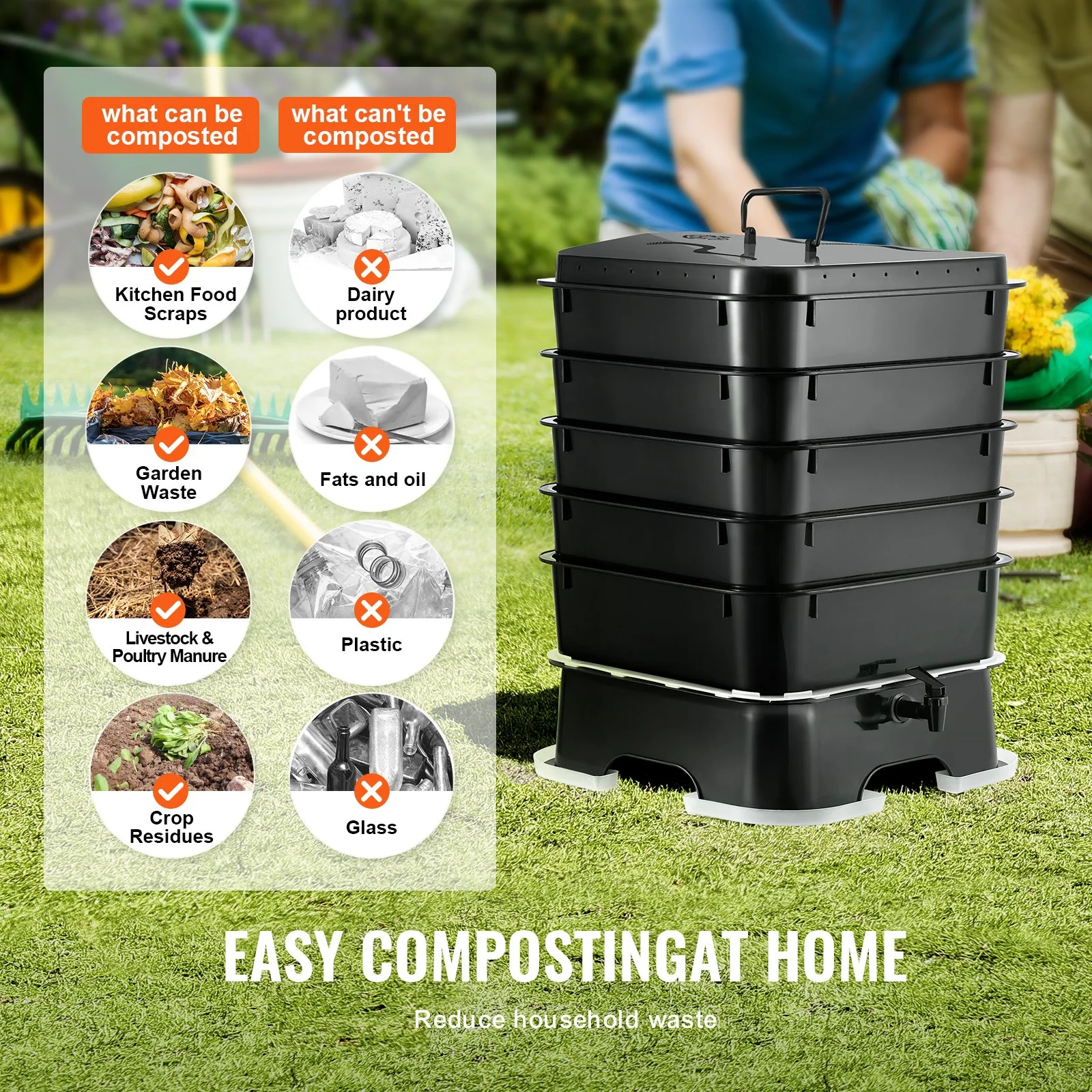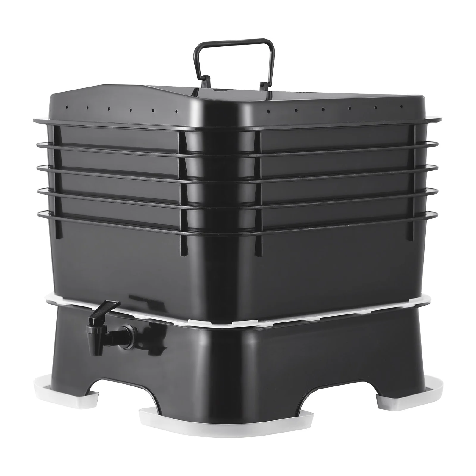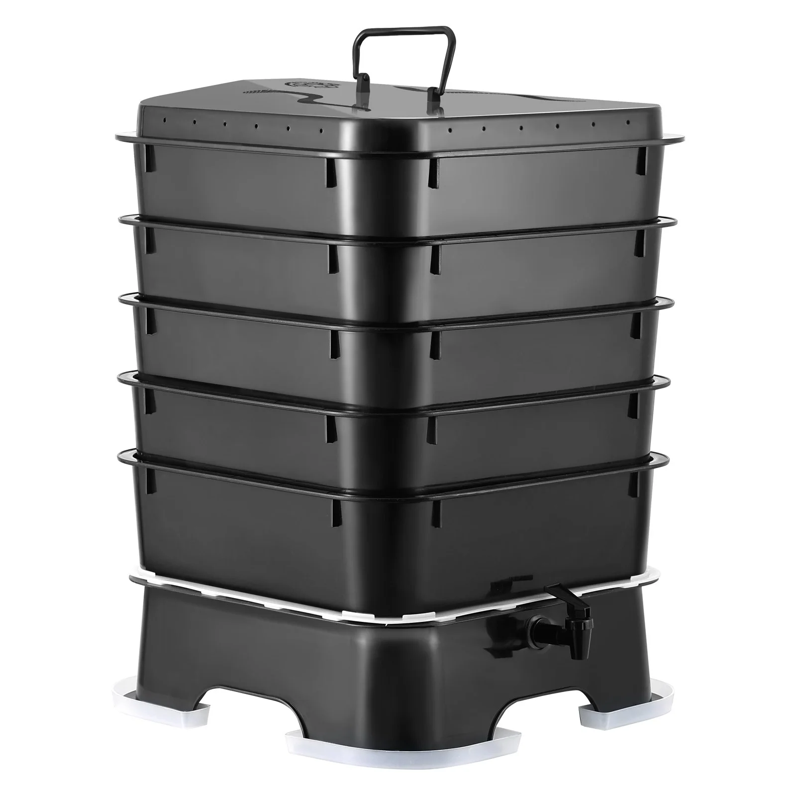 Setting up this 5-tray compost bin is a breeze, requiring no professional installation. Just follow the four steps in the instruction manual: Step 1. Insert the tap into the base groove and tighten it; Step 2. Place two trays one after another; Step 3. Put the lid on top of the trays; Step 4. Install the four plastic collection troughs. Assembly can be completed in just a few minutes.