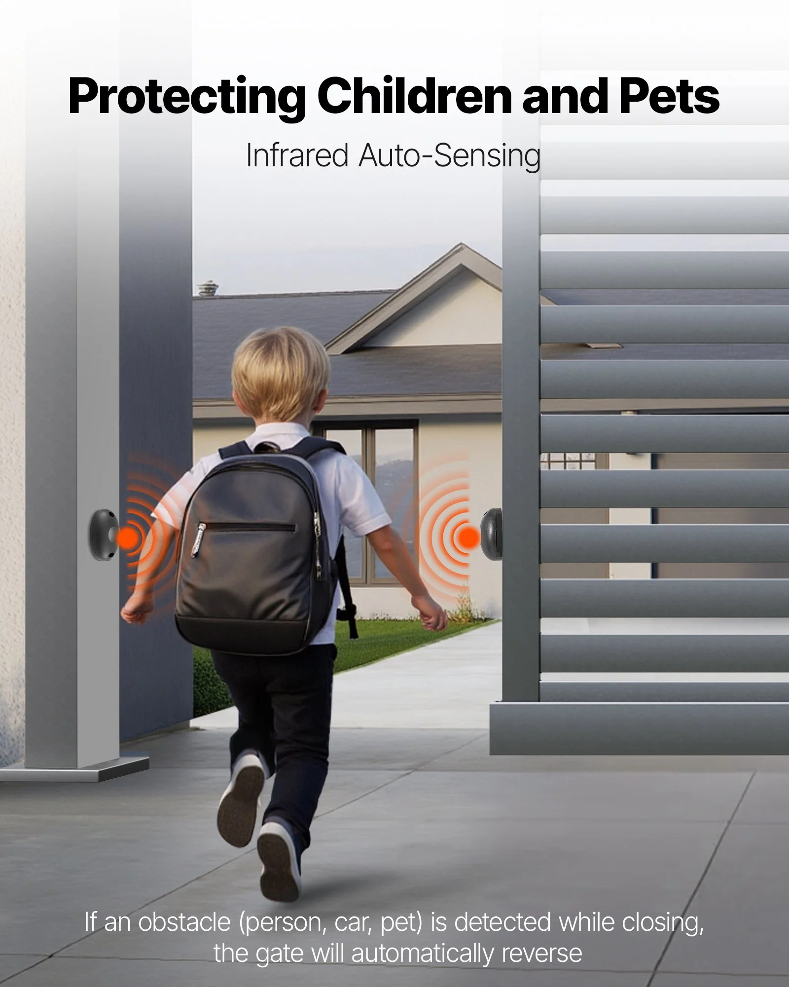 The automatic gate opener is equipped with infrared sensors. When the infrared sensor detects a person or vehicle, the gate automatically reverses to prevent accidental collisions, and ensures security of your kids and pet.
