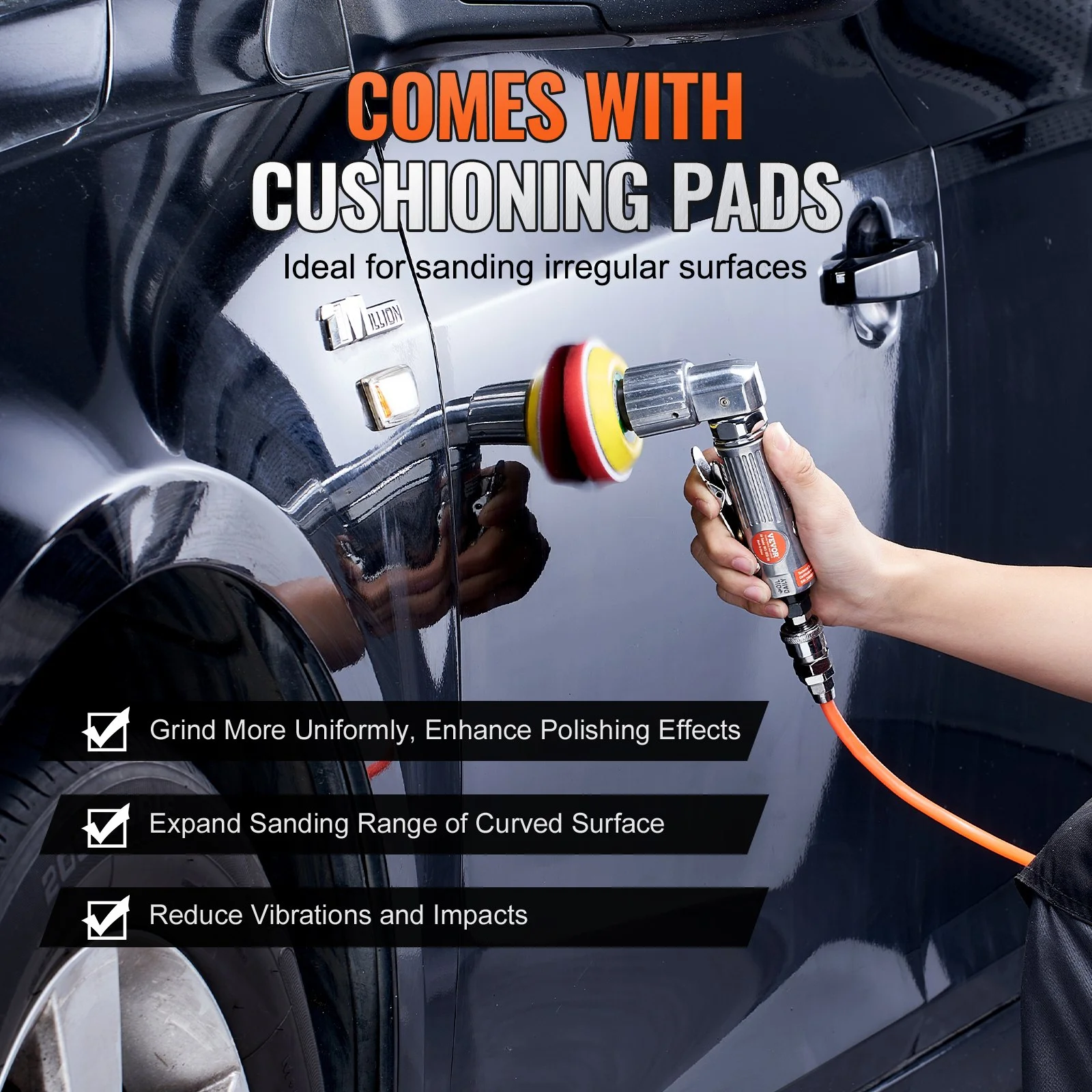 This random orbital air sander kit includes 3 cushioning pads (1/2/3 inches) that absorb vibrations and impacts, ensuring a smoother and more stable polishing process. Moreover, these pads can expand your polishing area and easily tackle workpieces of various shapes and curved surfaces.