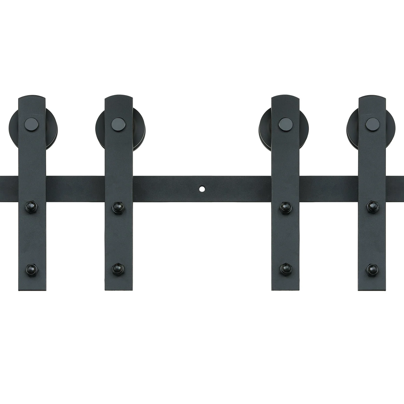 Our sliding barn door hardware is made of solid carbon steel with fine black powder coated surface. It delivers excellent anti-corrosion performance for years of attractiveness and durability. This 8ft barn door track and hardware kit is suitable for double doors up to 4.3FT wide (2 doors total width) and weighing up to 330lbs, perfect for most doors. Fit Double Doors Total Width: 3.7-4.3FT; Fit Door Thickness: 1.3 "-1.8".