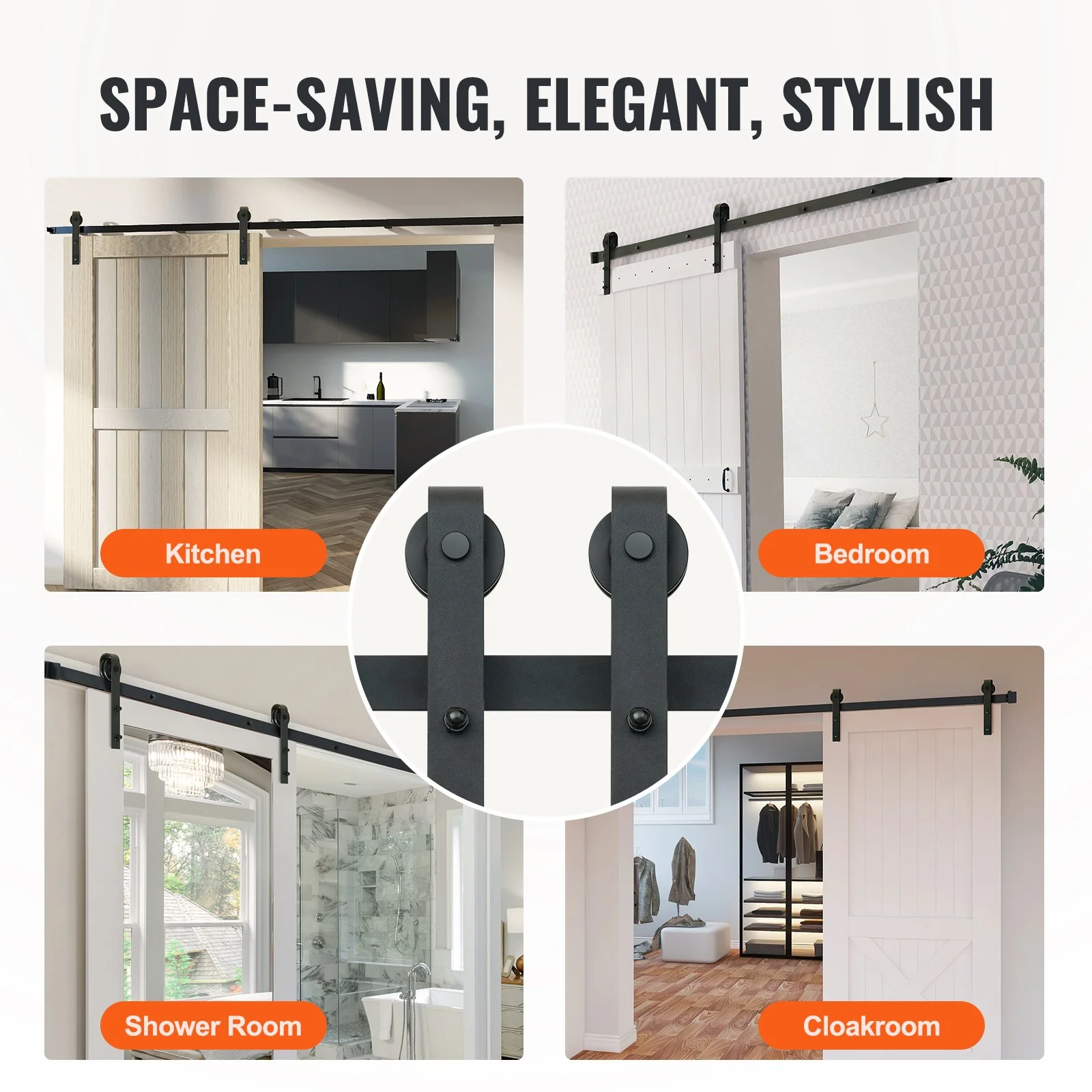 VEVOR 8ft J-shaped sliding barn door hardware kit comes with 2-section tracks, making the assembly exceptionally simpler and safer. This heavy-duty barn door hardware kit can easily hold up the barn door track without shaking, while the low clearance barn door hardware system requires less space above the doorway, both stable and space-saving!