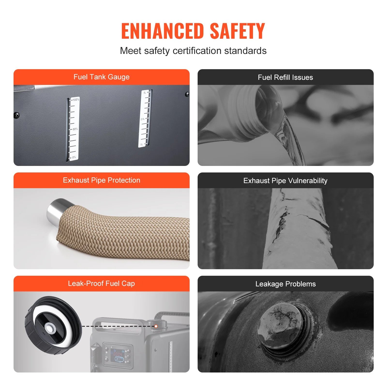 Our diesel heater features enhanced safety with a built-in CO alarm that continuously monitors CO levels, providing alerts or auto shut-off when needed. Additional upgrades include a leak-proof fuel tank cap, fuel level indicator, and overheat protection-ensuring peace of mind during extended use.