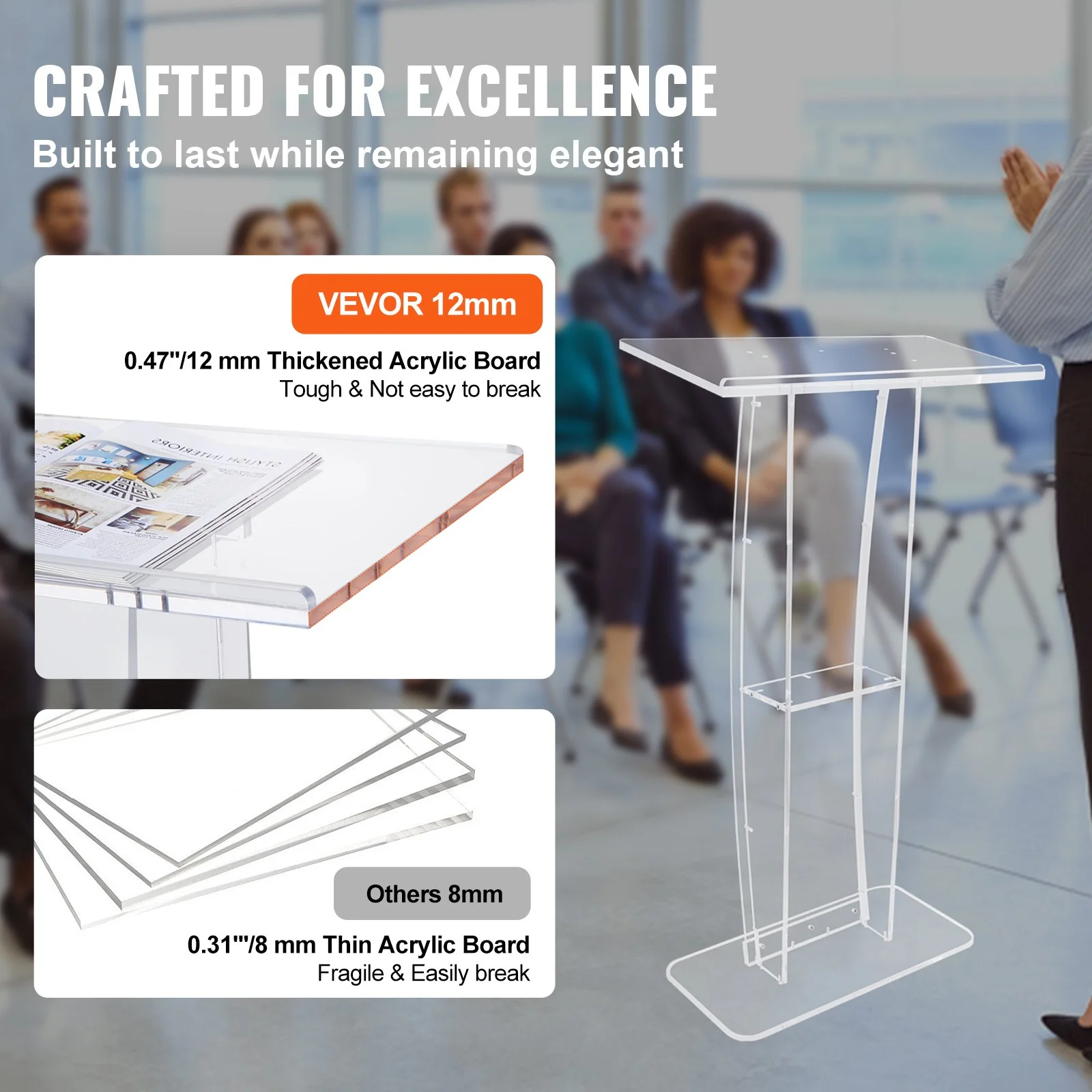 Elevate your presentations with the VEVOR acrylic podium! Standing tall at 47 inches, it provides excellent posture support, making it perfect for a wide range of public speaking venues such as churches, weddings, seminars, schools, and more.