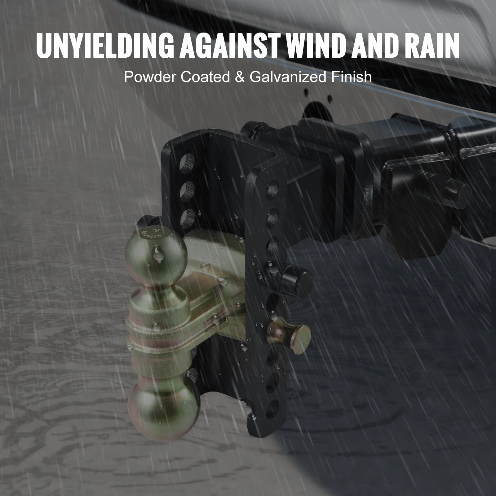 Rain, sun, or a surprise sandstorm _ our trailer hitch isn't fussy. With its powder-coated ball head mount and galvanized hitch head, it laughs in the face of the elements, whether in the scorching summer sun or the cold winter. Bring it on, Mother Nature!
