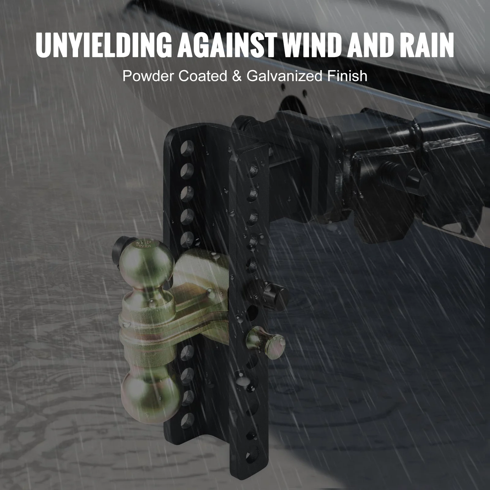 Rain, sun, or a surprise sandstorm _ our trailer hitch isn't fussy. With its powder-coated ball head mount and galvanized hitch head, it laughs in the face of the elements, whether in the scorching summer sun or the cold winter. Bring it on, Mother Nature!