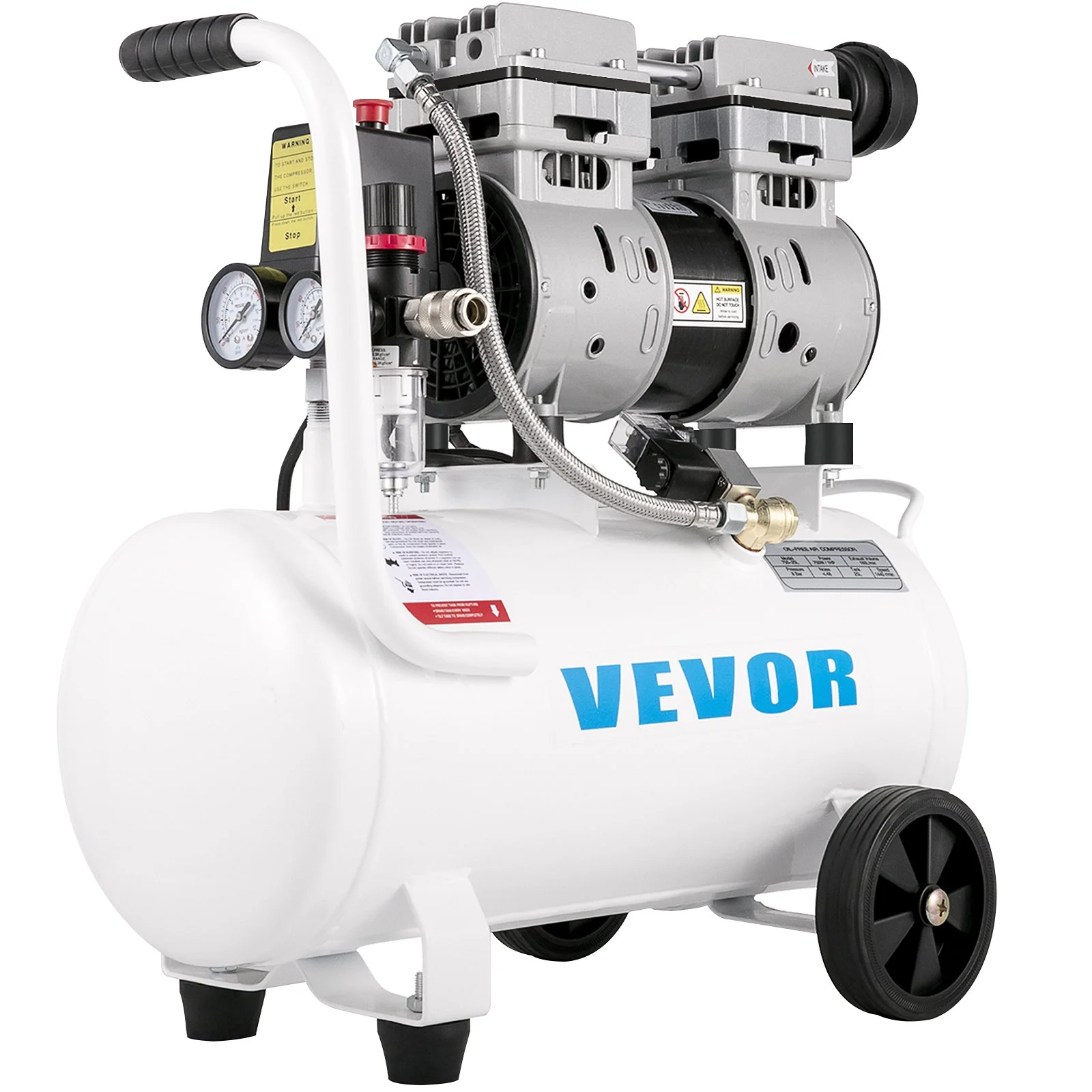 The air compressor is designed with 2 wheels and a handle for easy moving and transportation, and 2 non-slip feet pads for stability. Moreover, it is lightweight enough for convenient use.