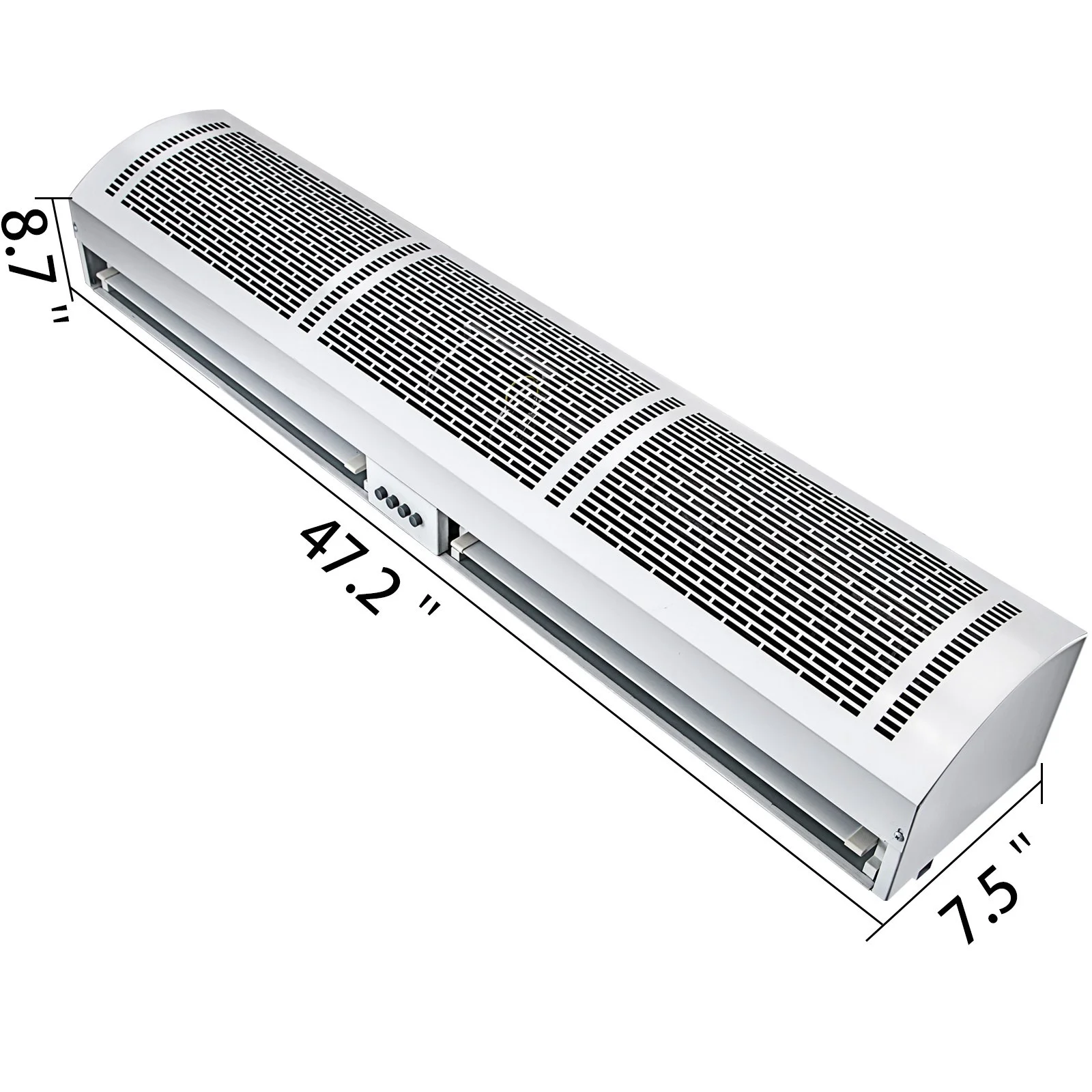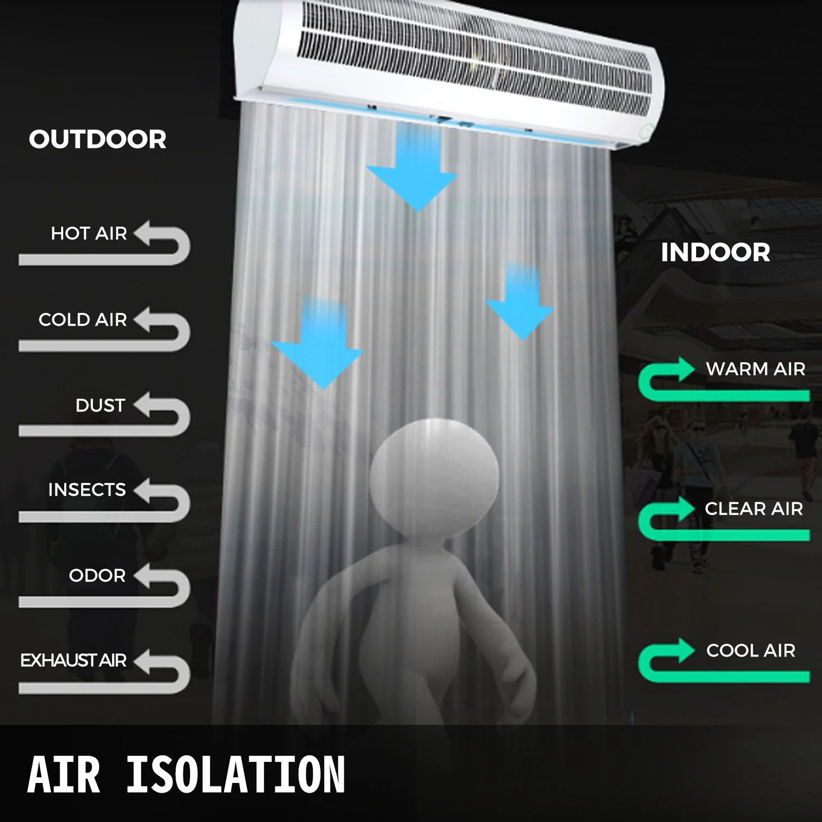 ISOLATE INTERIOR FROM EXTERIOR- The commercial air curtain, made of galvanized material, effectively keeps the conditioned air inside and blocks 90% of hot/cold air, dust, flying insects, etc. 47.2"x7.5"x8.7" in dimensions.
