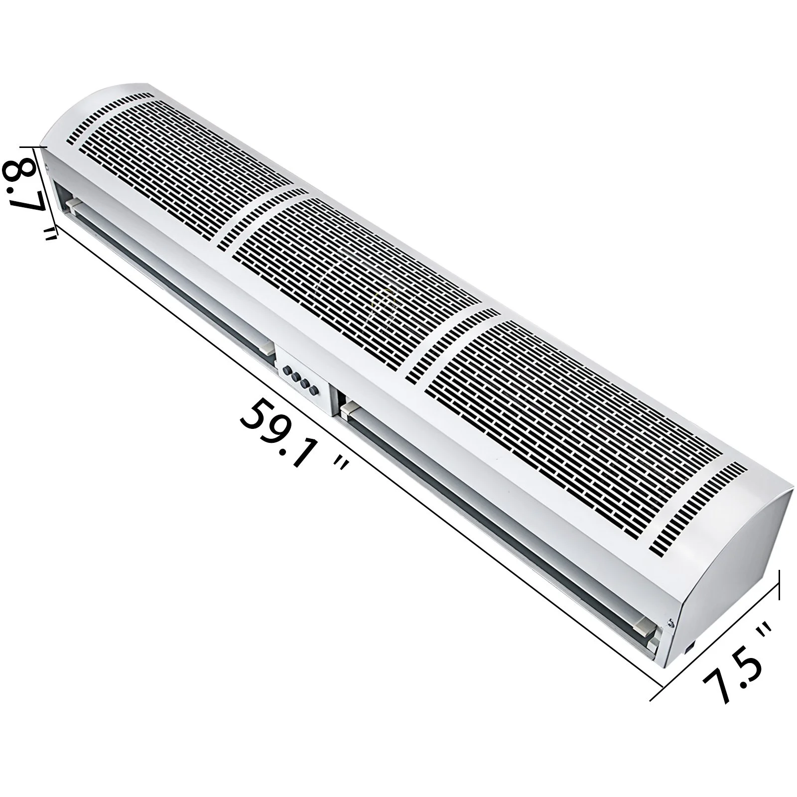 The commercial air curtain, made of galvanized material, effectively keeps the conditioned air inside and blocks 90% of hot/cold air, dust, flying insects, etc. 59.1"x7.5"x8.7" in dimensions.