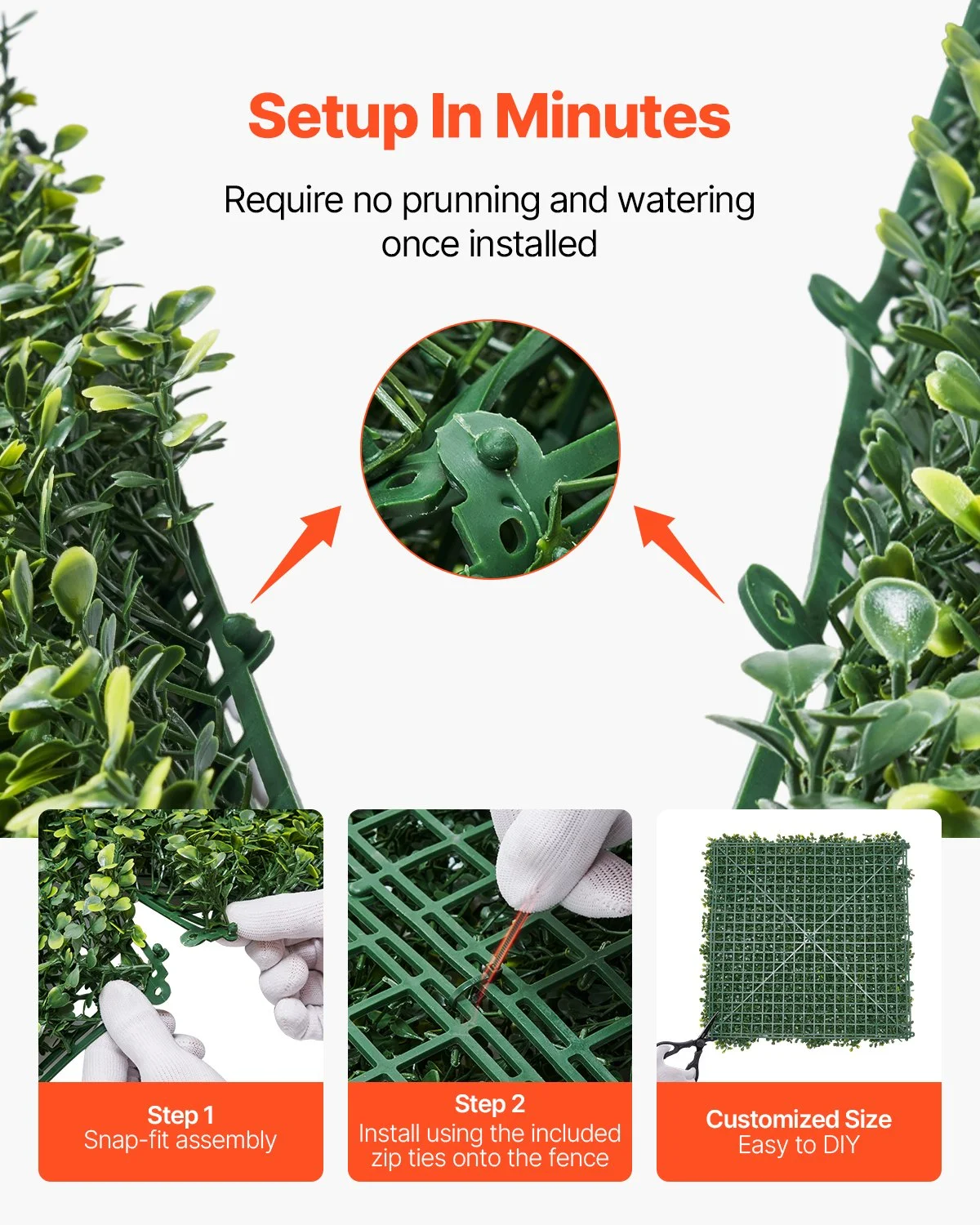 The interlocking snap system allows for fast and secure assembly of the plant wall. Additionally, we provide 100 complimentary zip ties for firmly attaching the panels to fences or other surfaces. The plant wall is flexible and can be easily cut, making it ideal for DIY designs tailored to your needs