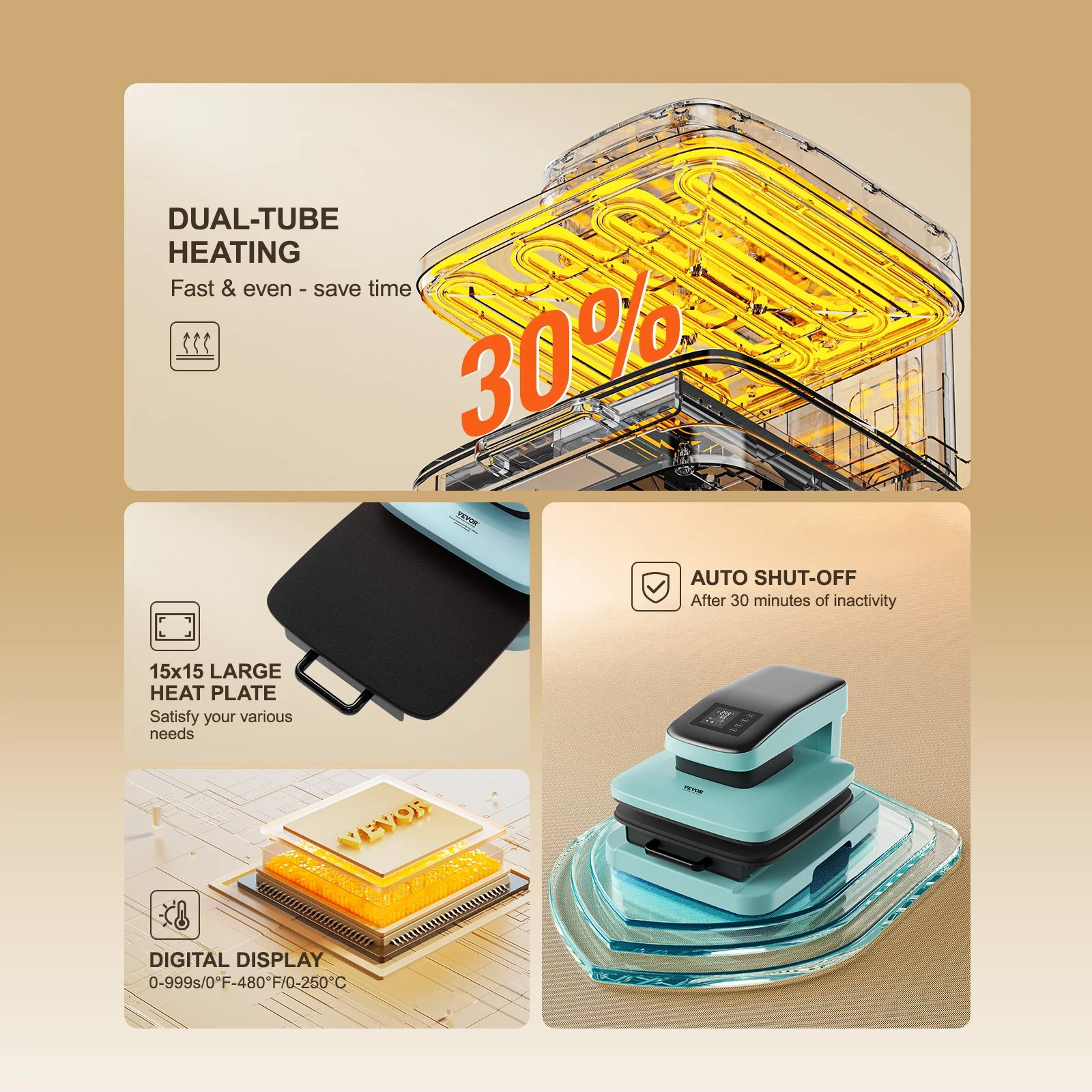 The automatic heat press quickly reaches 150��C in just 4 minutes and 30 seconds, saving up to 30% of your time compared to traditional devices. With a 15 x 15-inch large panel and a more dense and uniform heating tube structure, it eliminates dark spots, ensuring fuller and more even transfer patterns. You can handle more projects in less time.