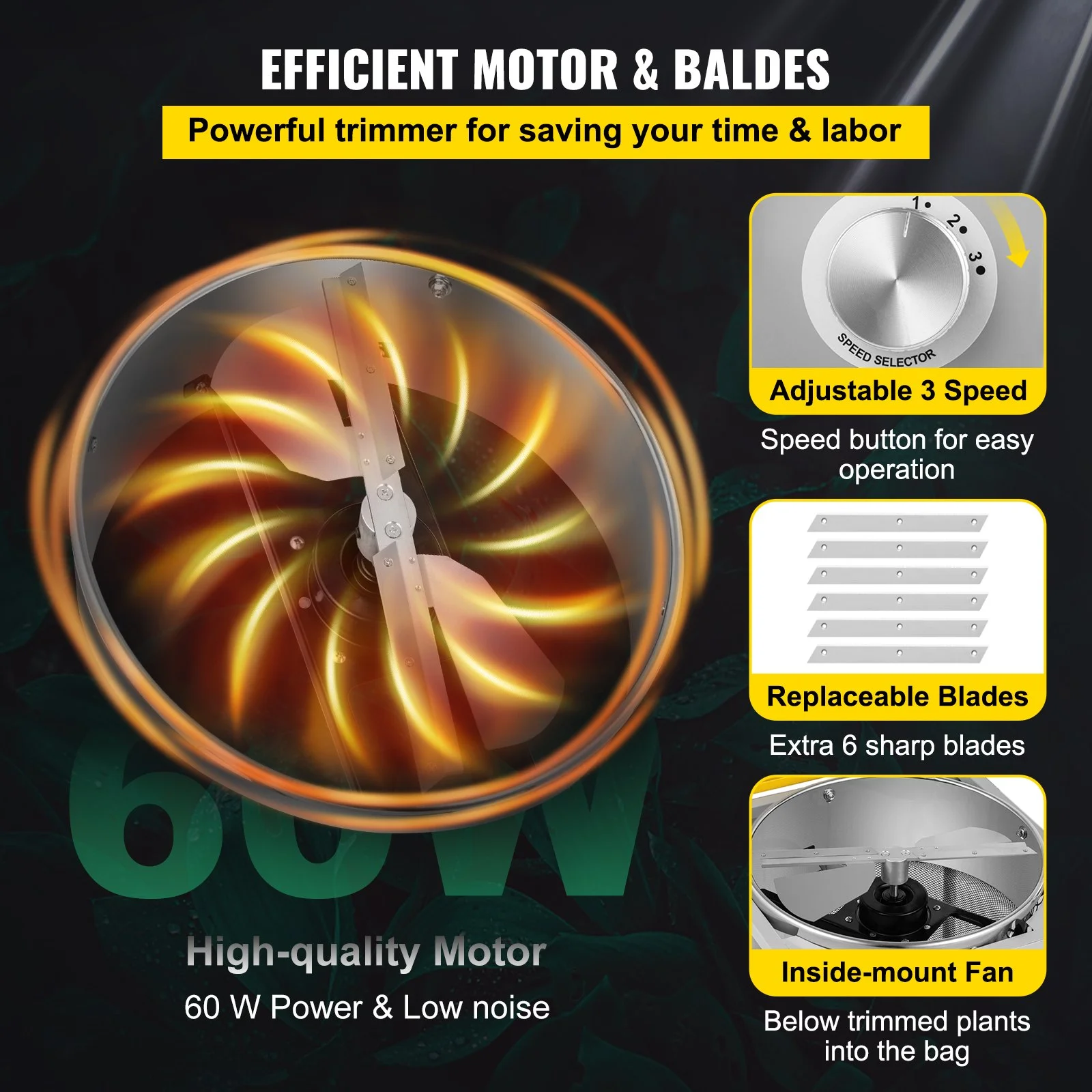 The 18" automatic bud trimmer features three speeds for you to adjust according to your time and favorites. The 60 W motor ensures high efficiency and low noise. And the security valve can stop the blades while opening the grate to avoid cutting your hands. It features upgrade rounded slots for security, not easy to hurt your hands.