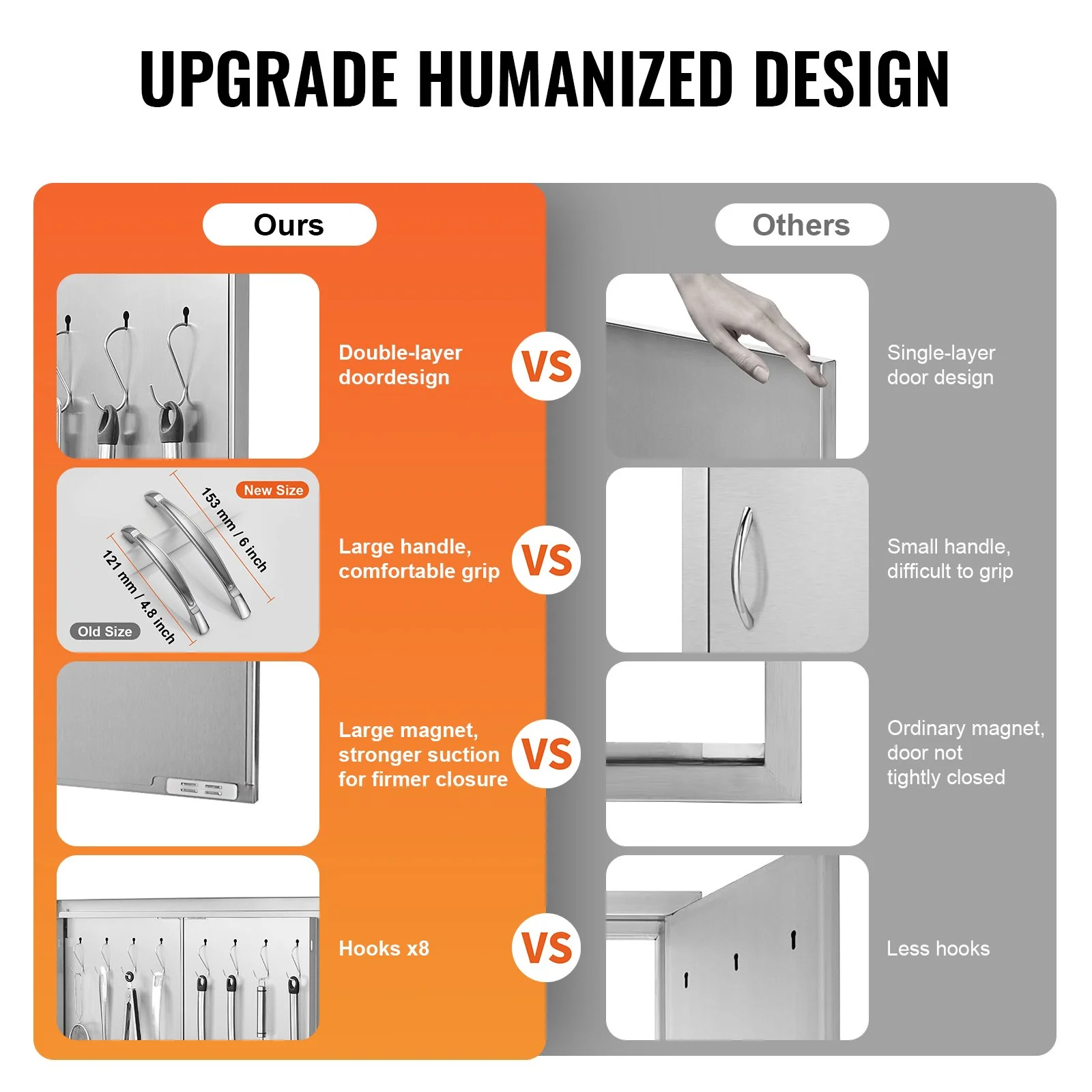 Featuring a hidden handle design, making the door look better and reducing the chance of accidental bruising. The door frame edges are bent and thickened for safer use. Added hooks allow you to store more items. It provides you a more user-friendly experience, allowing you to enjoy cooking in your outdoor kitchen without worries.