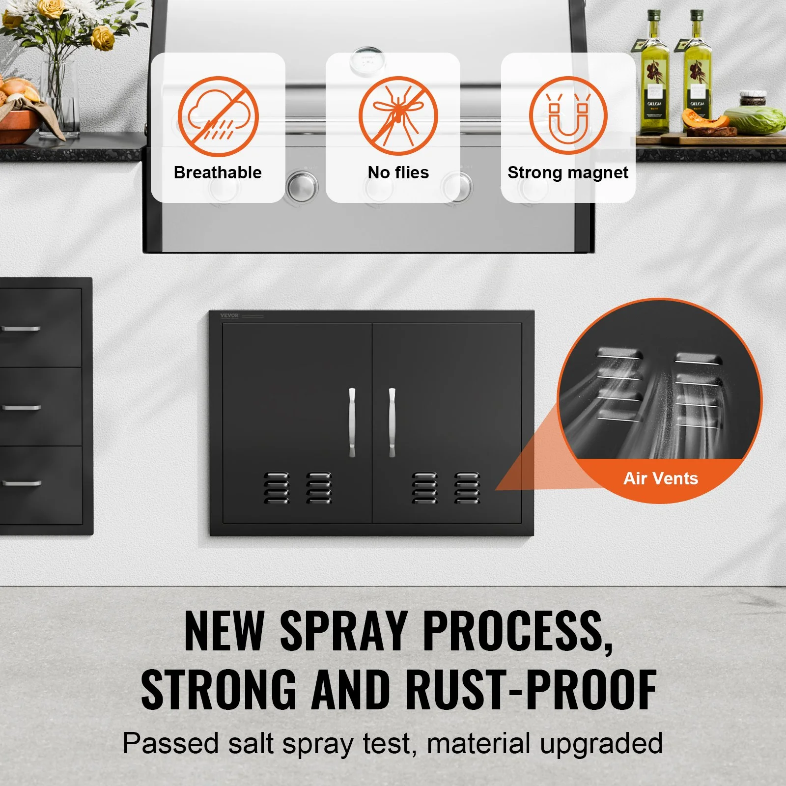 Utilizing a new powder-coated matte black process, rust-proof and waterproof, easy to clean, the exquisite black color makes your outdoor cooking area more unique and elegant. The integrated thickened frame structure is durable, with a fully seamless design, no sharp corners. The unique U-shaped panel provides better strength and durability. Magnets at the top and bottom keep the cabinet tightly closed, effectively preventing insects from accessing your food or anything inside the cabinet.