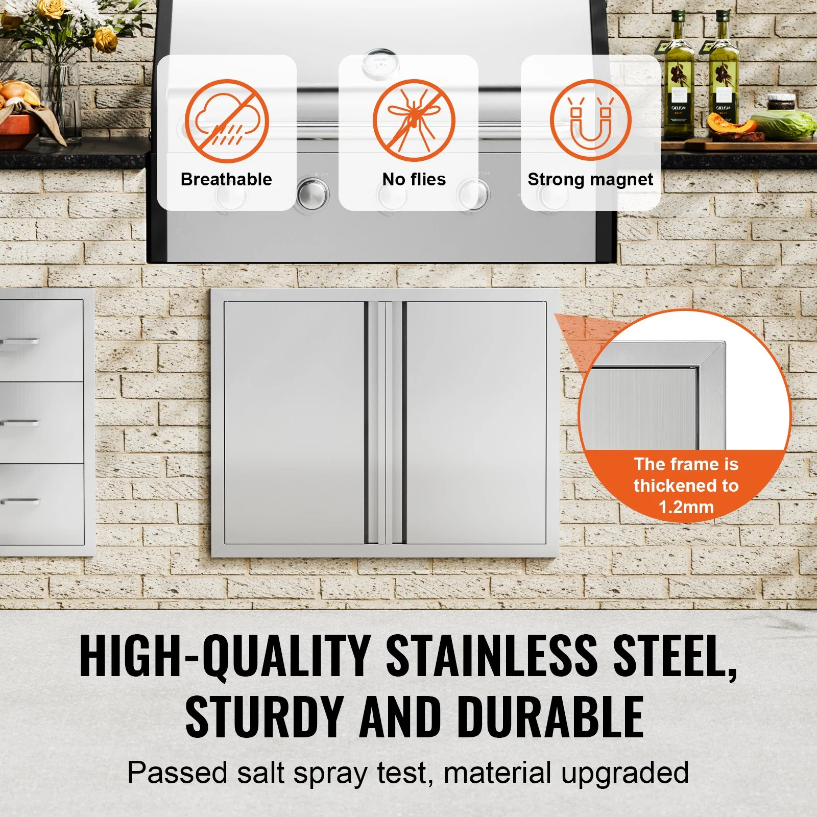 This access door is made of sturdy high-quality stainless steel, rust-proof and waterproof. You can clean it well without leaving any traces. The integrated thickened frame structure is durable, with a fully seamless design, no sharp corners. The unique U-shaped panel structure provides better strength and durability. Magnets at the top and bottom keep the cabinet tightly closed, effectively preventing insects from accessing your food or anything inside the cabinet.