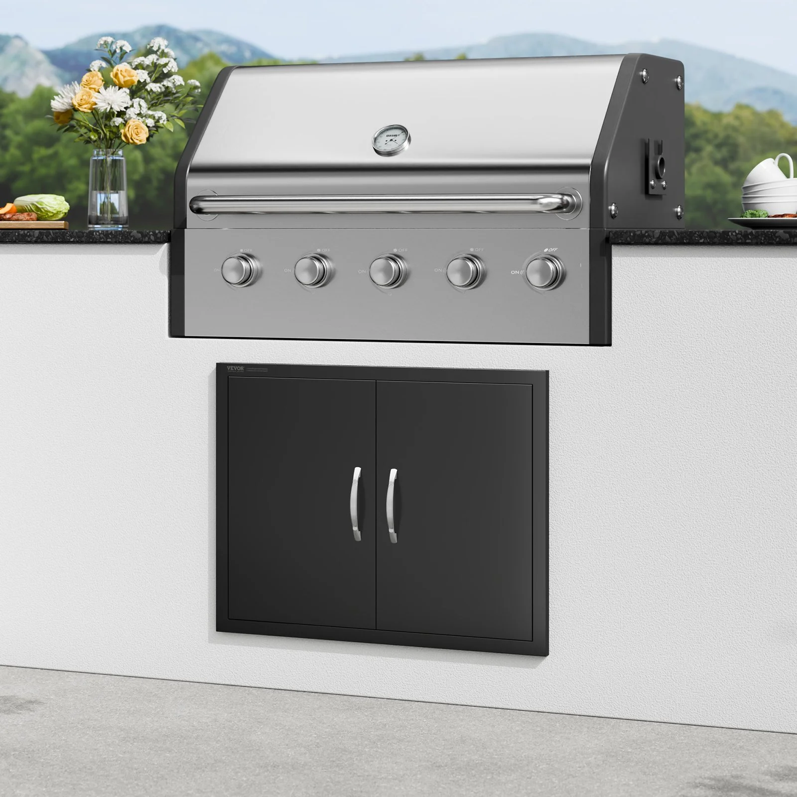 Utilizing a new powder-coated matte black process, rust-proof and waterproof, easy to clean, the exquisite black color makes your outdoor cooking area more unique and elegant. The integrated thickened frame structure is durable, with a fully seamless design, no sharp corners. The unique U-shaped panel provides better strength and durability. Magnets at the top and bottom keep the cabinet tightly closed, effectively preventing insects from accessing your food or anything inside the cabinet.