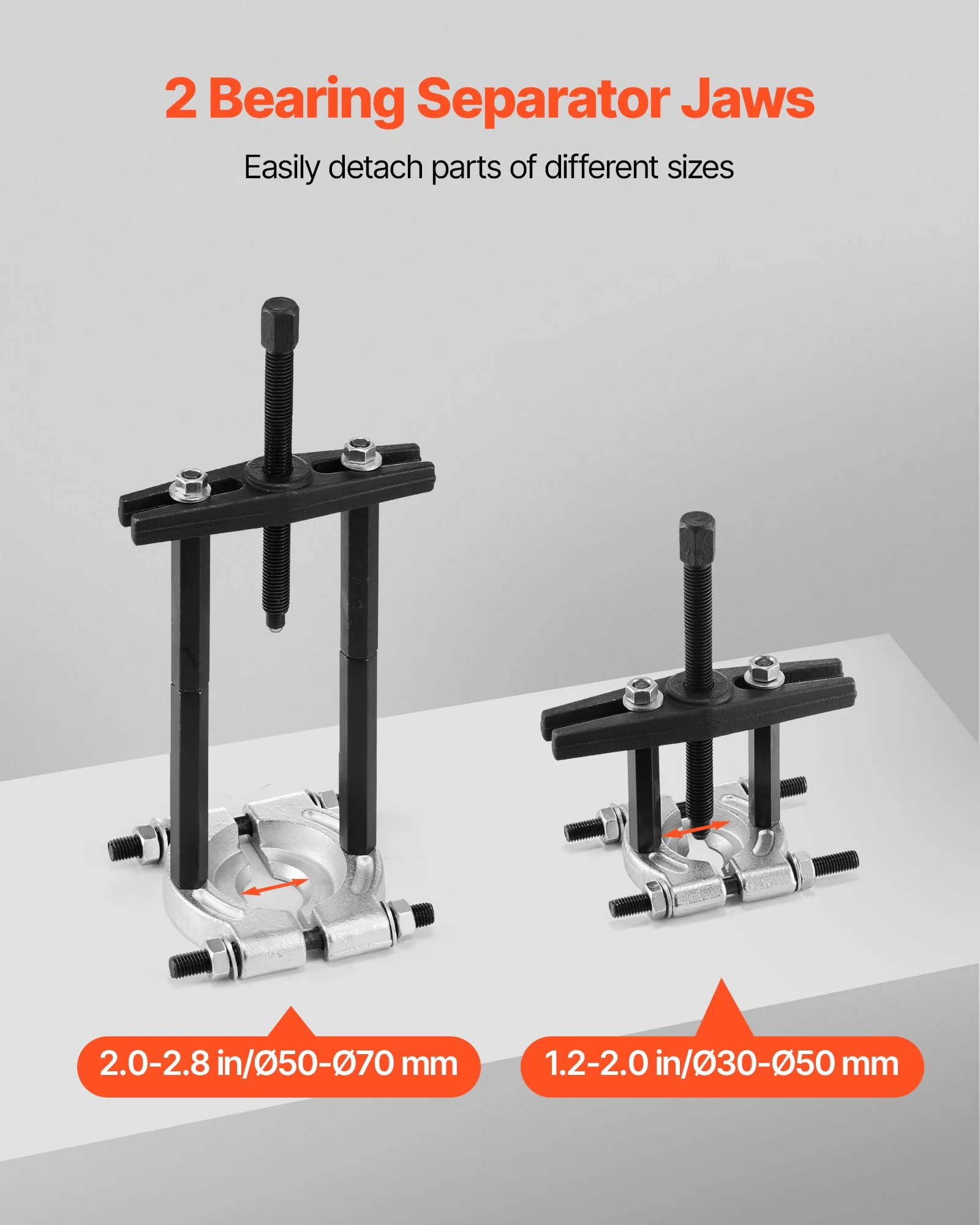 Our bearing puller features two separator sizes. The large one adjusts from 2.0-2.8 in (Ø50-70 mm), while the small one adjusts from 1.2-2.0 in (Ø30-50 mm). Ideal for various bearing, gear, pulley, and steering wheel sizes