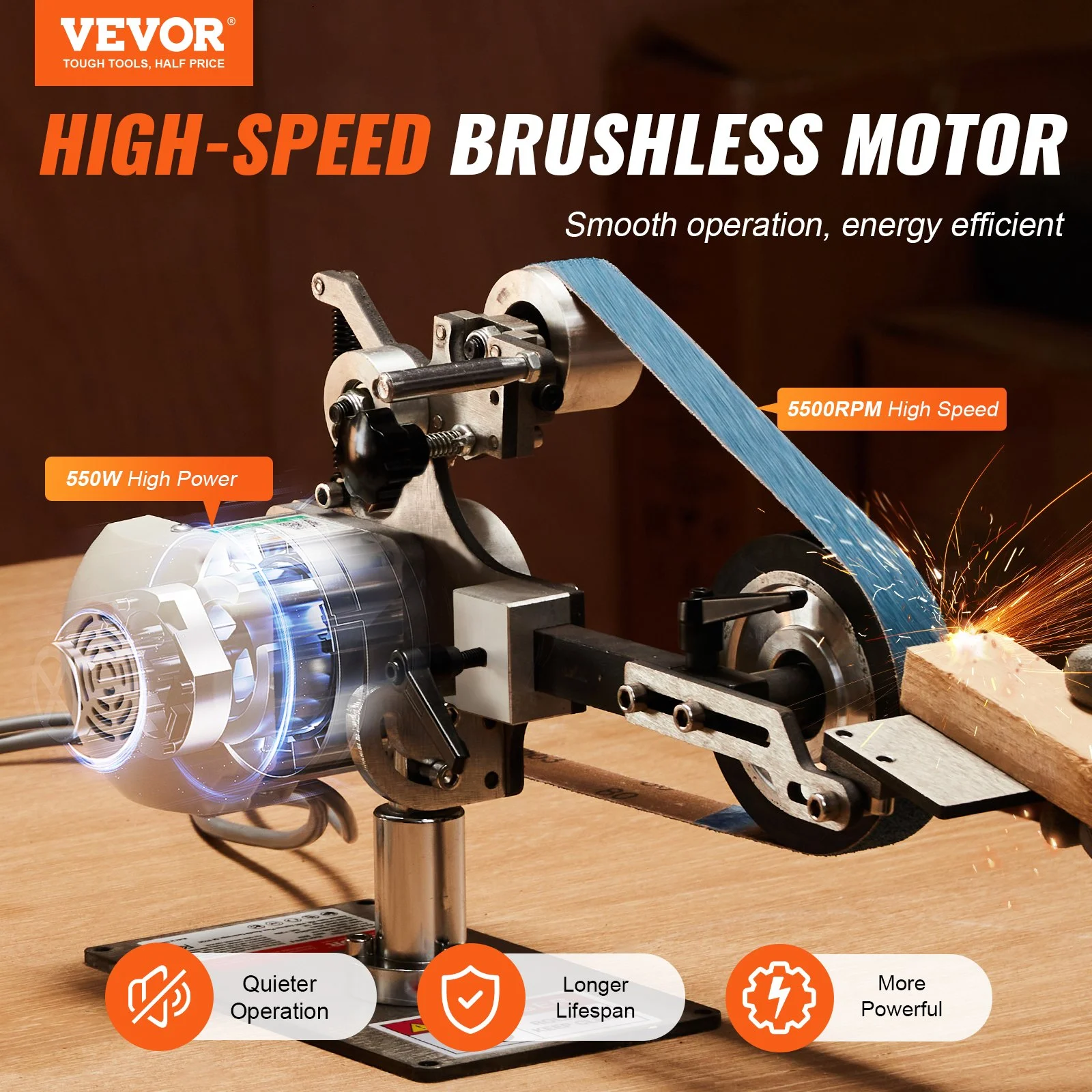Equipped with a 550W pure copper motor running at 5500 rpm, the VEVOR belt grinder sander delivers superior grinding power, quieter operation, and enhanced durability compared to ordinary motors. Enjoy smooth running and stable tracking without worrying about overheating.