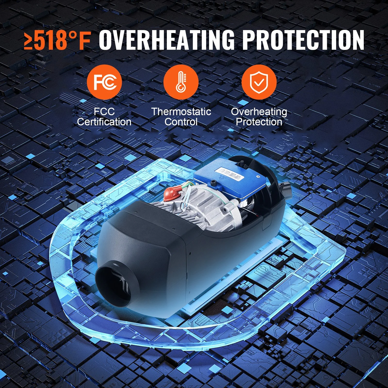 Our diesel air heater features a high safety system, allowing for worry-free usage in various environments such as cars, RVs, ships, and indoors. It provides constant temperature control, timing function, voice broadcasting, preheating, and overheating protection at ≥270°C/518°F, ensuring a safe and comfortable experience throughout the night.
