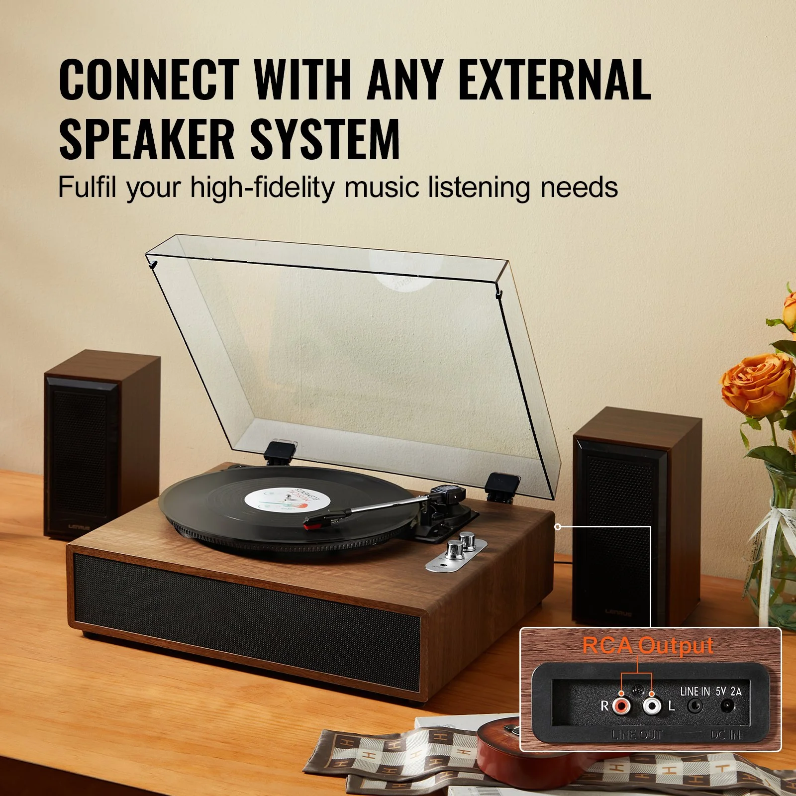 Our turntable vinyl record player is equipped with the RCA jack for easy connection to external speakers or amplifiers. Enjoy enhanced audio performance and fill larger spaces with rich, vibrant sound. Whether you're hosting a party or relaxing at home, connecting to external devices ensures you can enjoy your music in any setting.