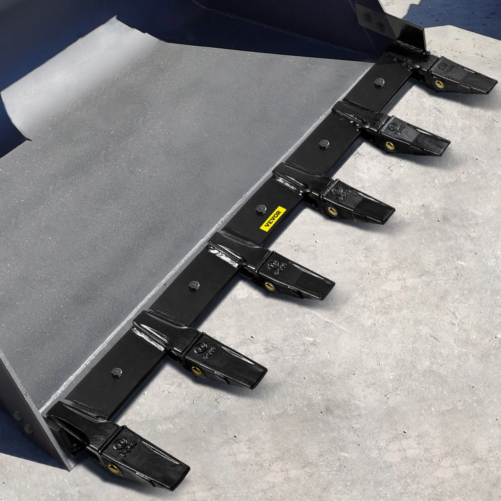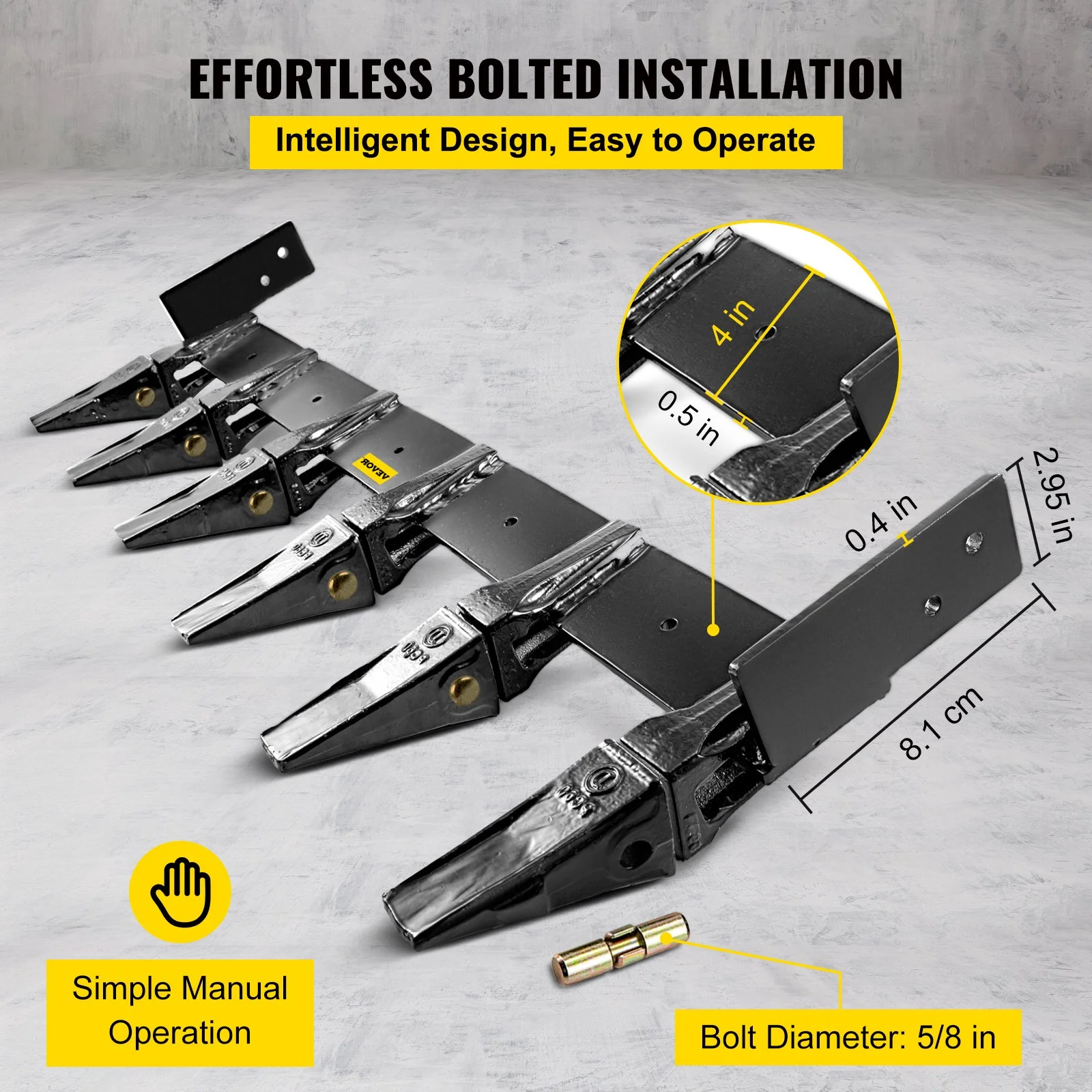 The bucket tooth bar is equipped with 6 teeth, the clearance is 9.84", which is replaceable and interchangeable. Generally, the broken part of the bucket tooth is a tooth tip, which means that you can replace a broken tooth instead of buying a brand new track.