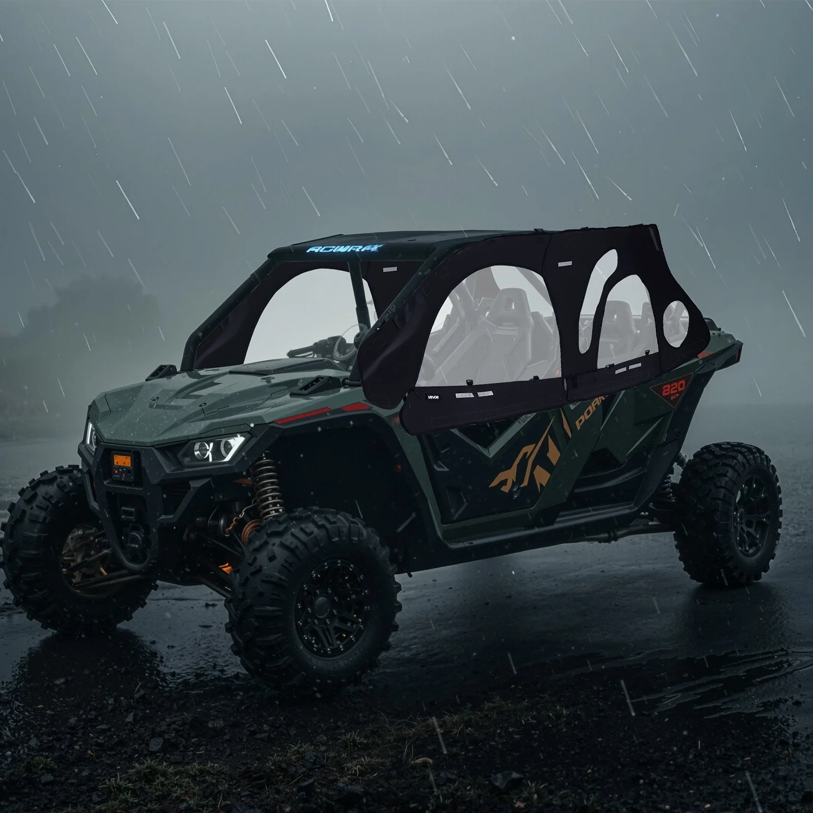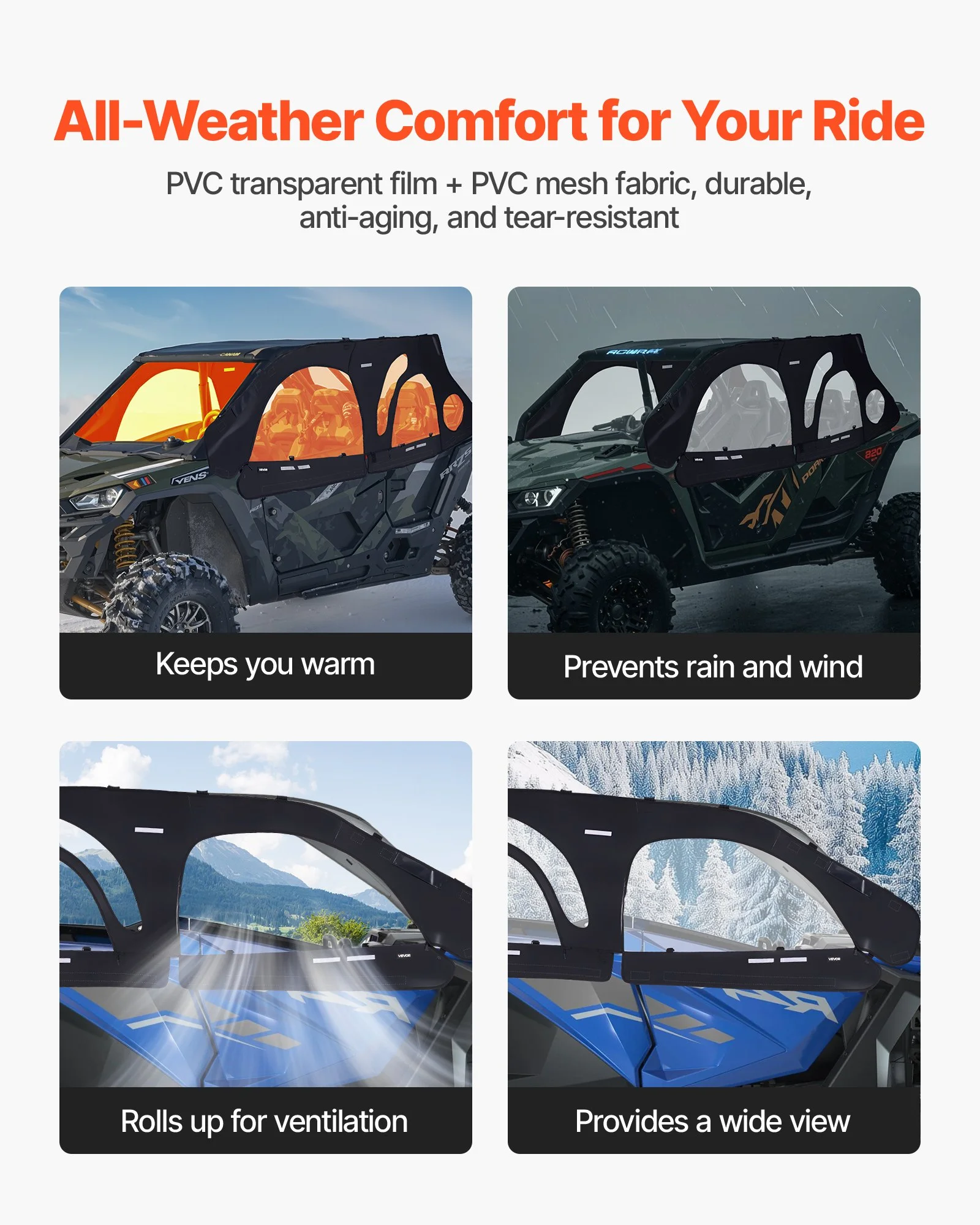 Crafted from high-quality transparent PVC film and PVC mesh fabric, this UTV soft cab enclosure is waterproof, easy to clean, and resistant to yellowing. It shields you from dust and rain in summer, wind and snow in winter