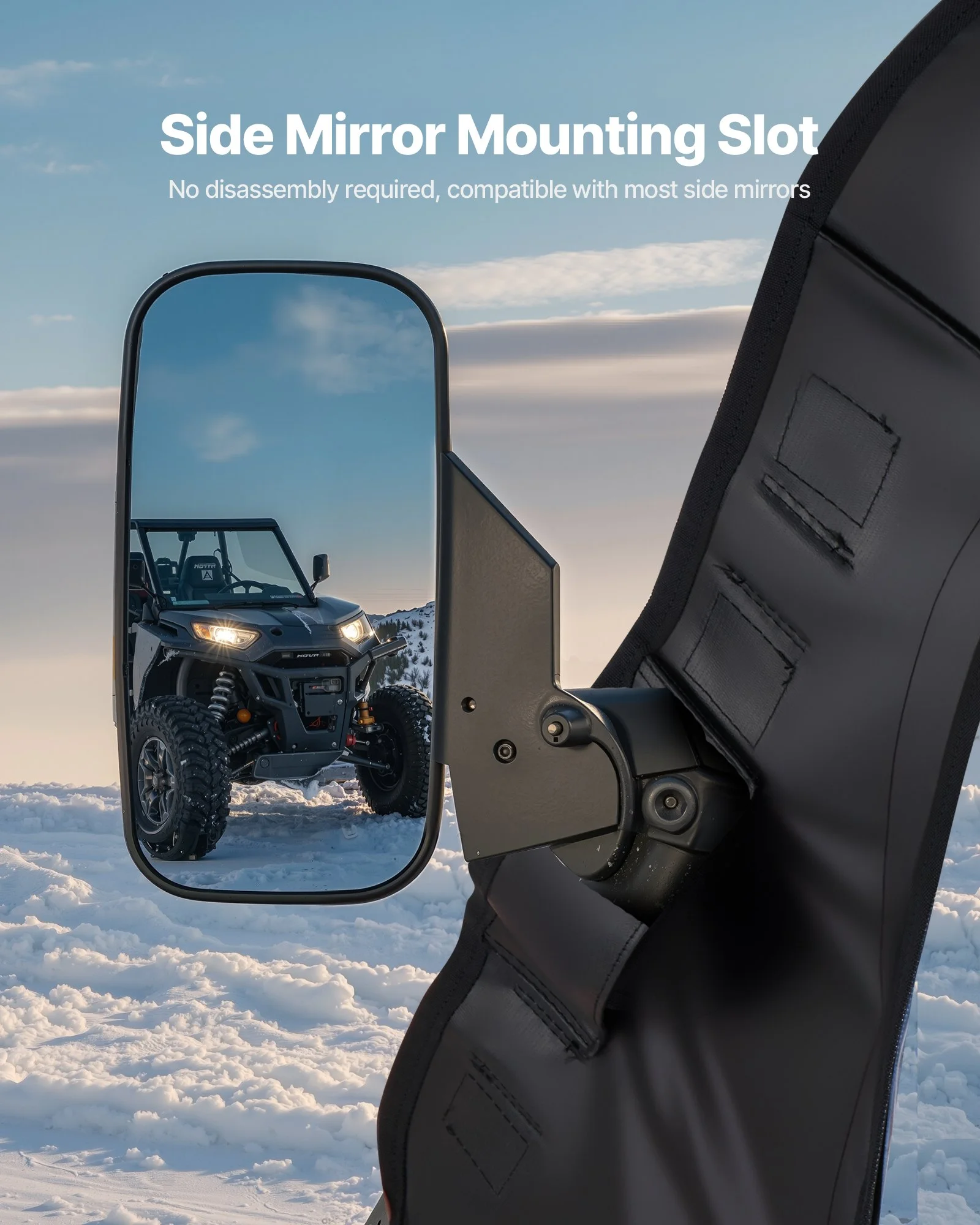 Our UTV cab enclosures feature specially designed cutouts to fit most UTV side mirrors. No need to remove side mirrors during installation, making setup quicker and more flexible