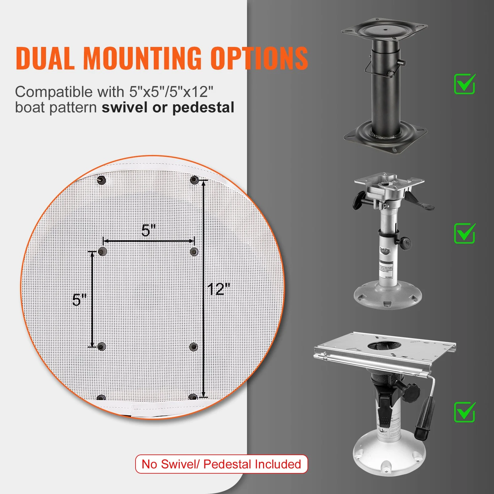 Install the captain bucket seat is a breeze with a choice of 5" x 5" or 5" x 12" boat pattern swivel or pedestal. We provide mounting screws and washers, making it quick and convenient to attach to most boat patterns. Please note that boat pedestals and boat swivels are not included.