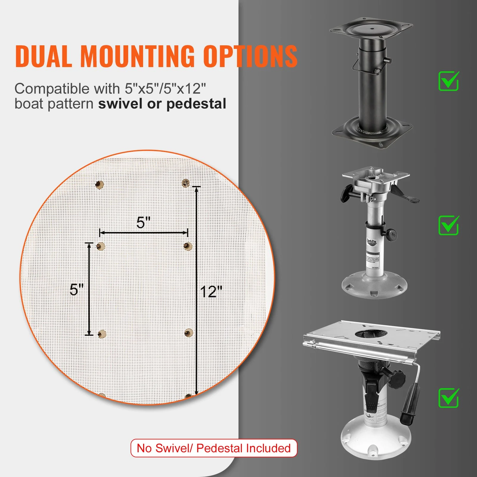 Install the captain bucket seat is a breeze with a choice of 5" x 5" or 5" x 12" boat pattern swivel or pedestal. We provide mounting screws and washers, making it quick and convenient to attach to most boat patterns. Please note that boat pedestals and boat swivels are not included.