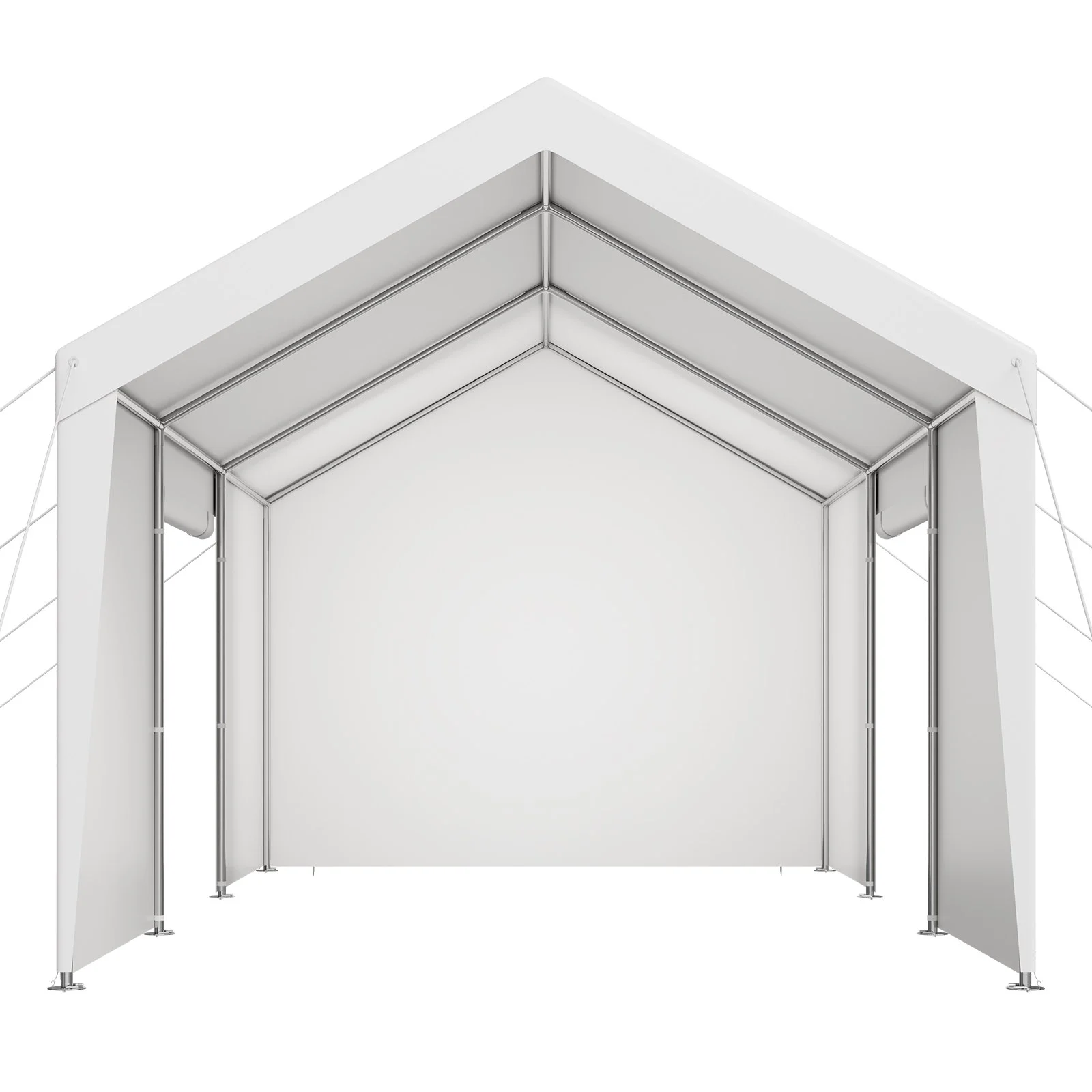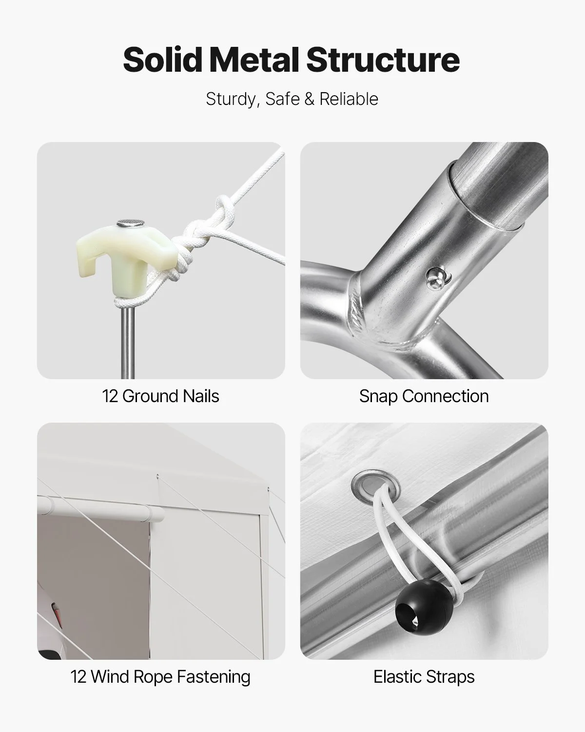 Made with galvanized steel pipes, the frame resists rust. The car canopy comes with alloy steel frame that is stronger and more durable than regular steel, able to withstand higher wind pressure and heavier weight, ensuring long-lasting use. Equipped with wind ropes and ground stakes for added stability in windy conditions.
