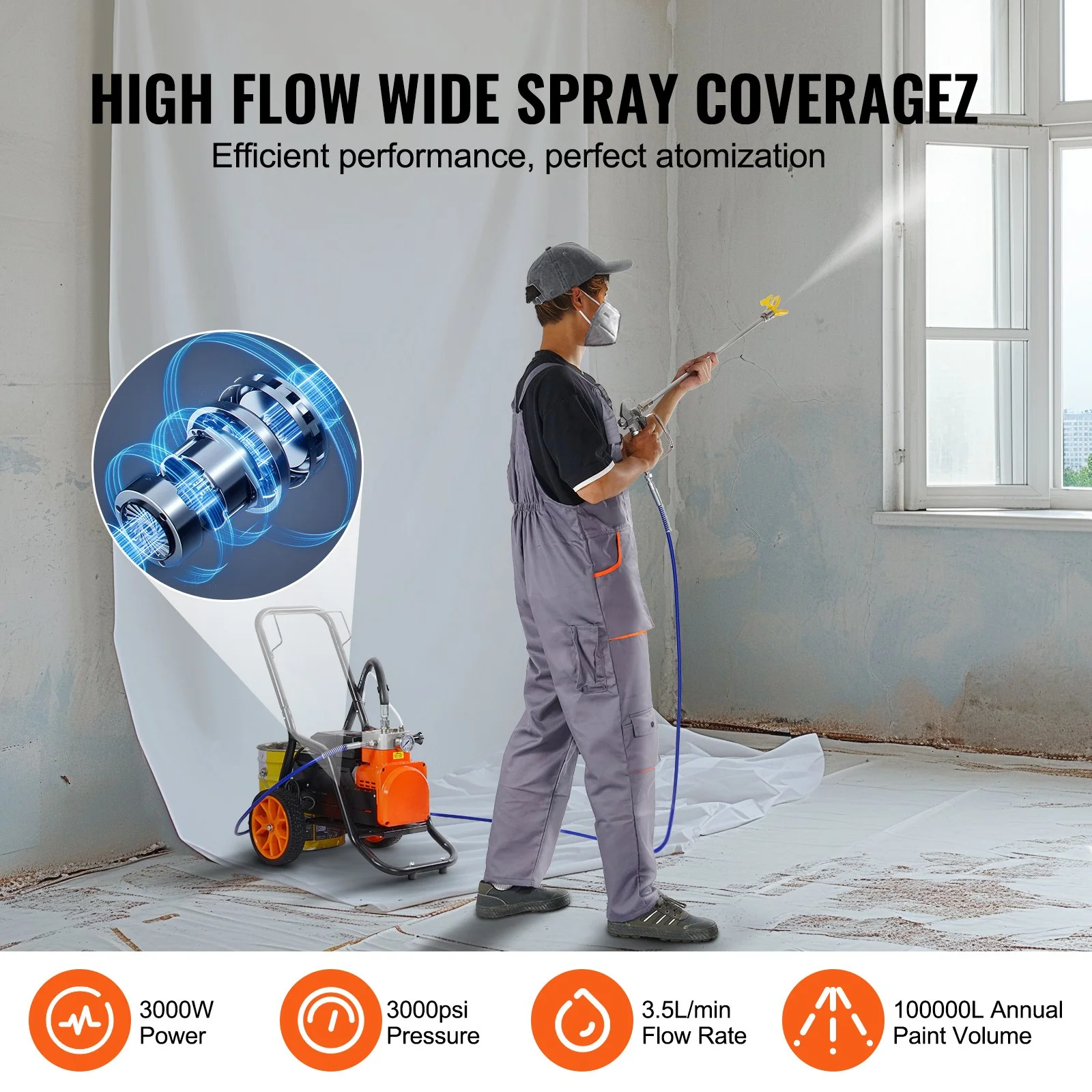 Equipped with a powerful 1700W motor, the airless paint sprayer with cart delivers up to 3000 psi pressure, quickly covering large areas. With a maximum flow rate of 3.5L/min, it ensures continuous and smooth application, making it 5 times faster than rolling and 12 times faster than brushing, perfect for medium to large spraying tasks.