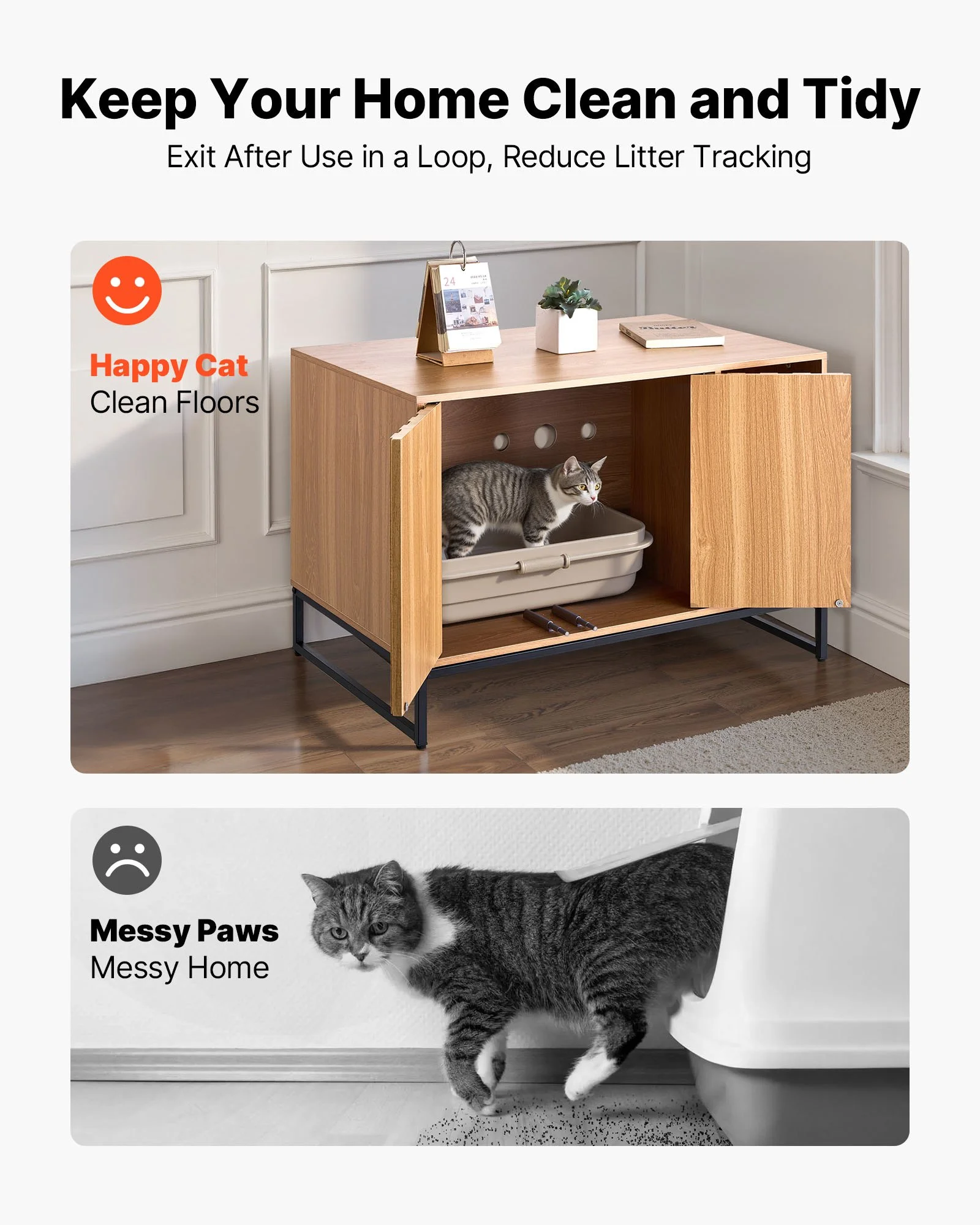 The wooden litter box enclosure features practical design, including press-to-open doors, a cat scratching pad, a hook, an easy-to-clean waterproof panel, a bottom height for robot vacuums, a user manual, and pre-drilled holes