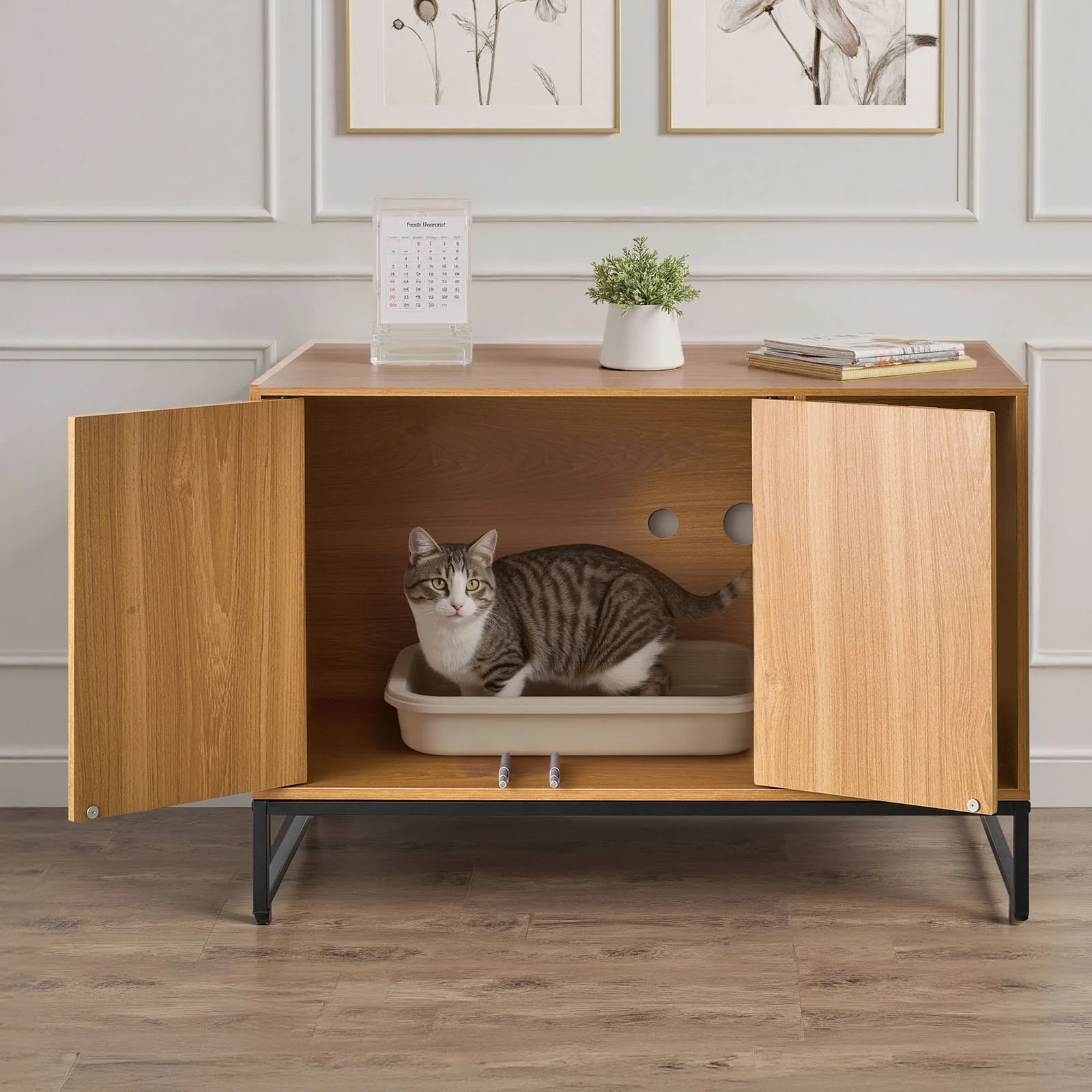 The cat litter box cabinet adopts an enclosed cabinet plus a hidden ventilation hole structure to create an odor-proof environment, which effectively blocks odor diffusion and keeps indoor air fresh for cat breathing