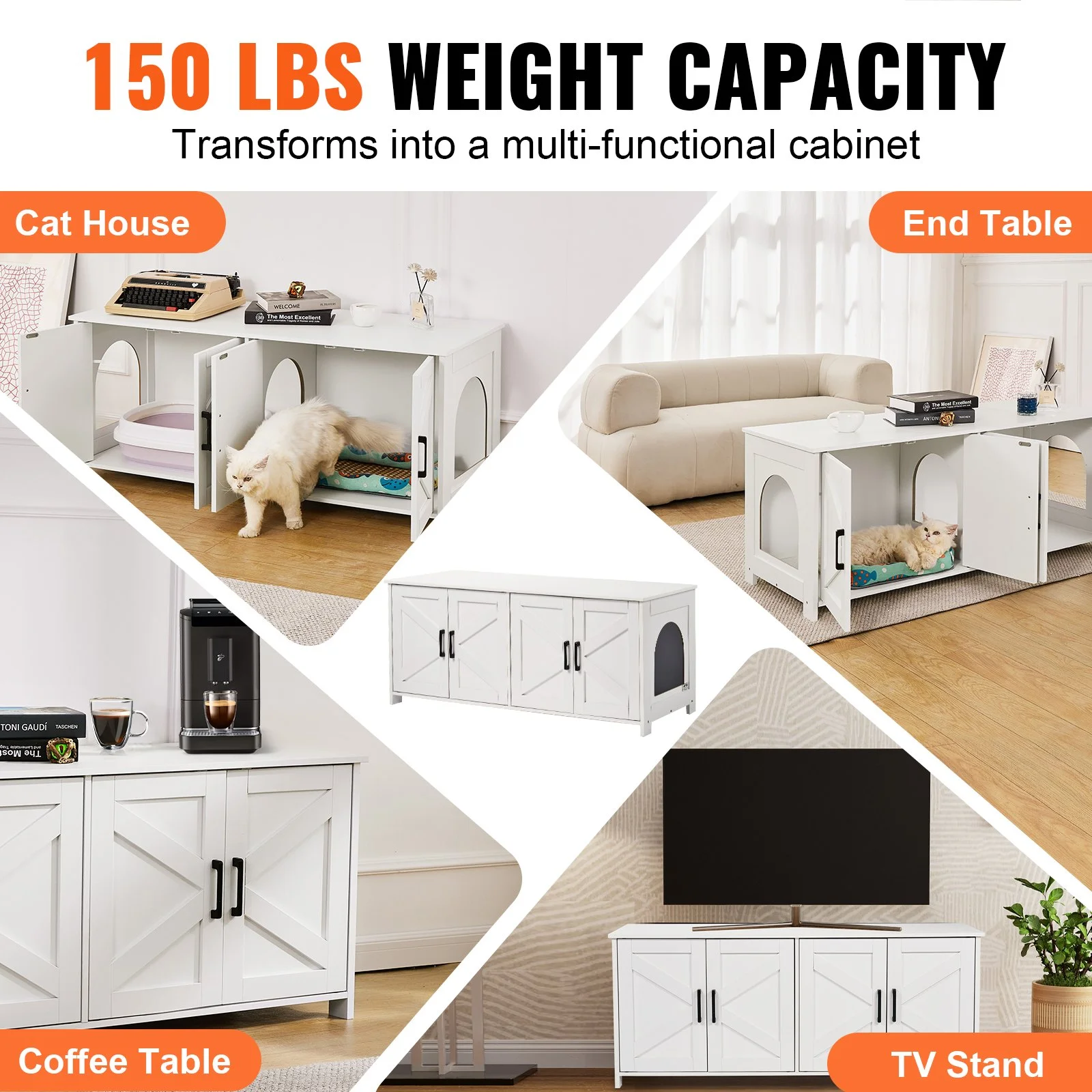 The top loading is up to 150lb/68kg, with a firm and stable structure, for safely placing vases, books or other decorations. The cat litter cabinet can also be used as a cat house, tea table, coffee table or TV cabinet. The bottom adds support feet to enhance stability and loading capacity up to 100lb/45kg, which can be placed on cat litter boxes or other heavy objects.