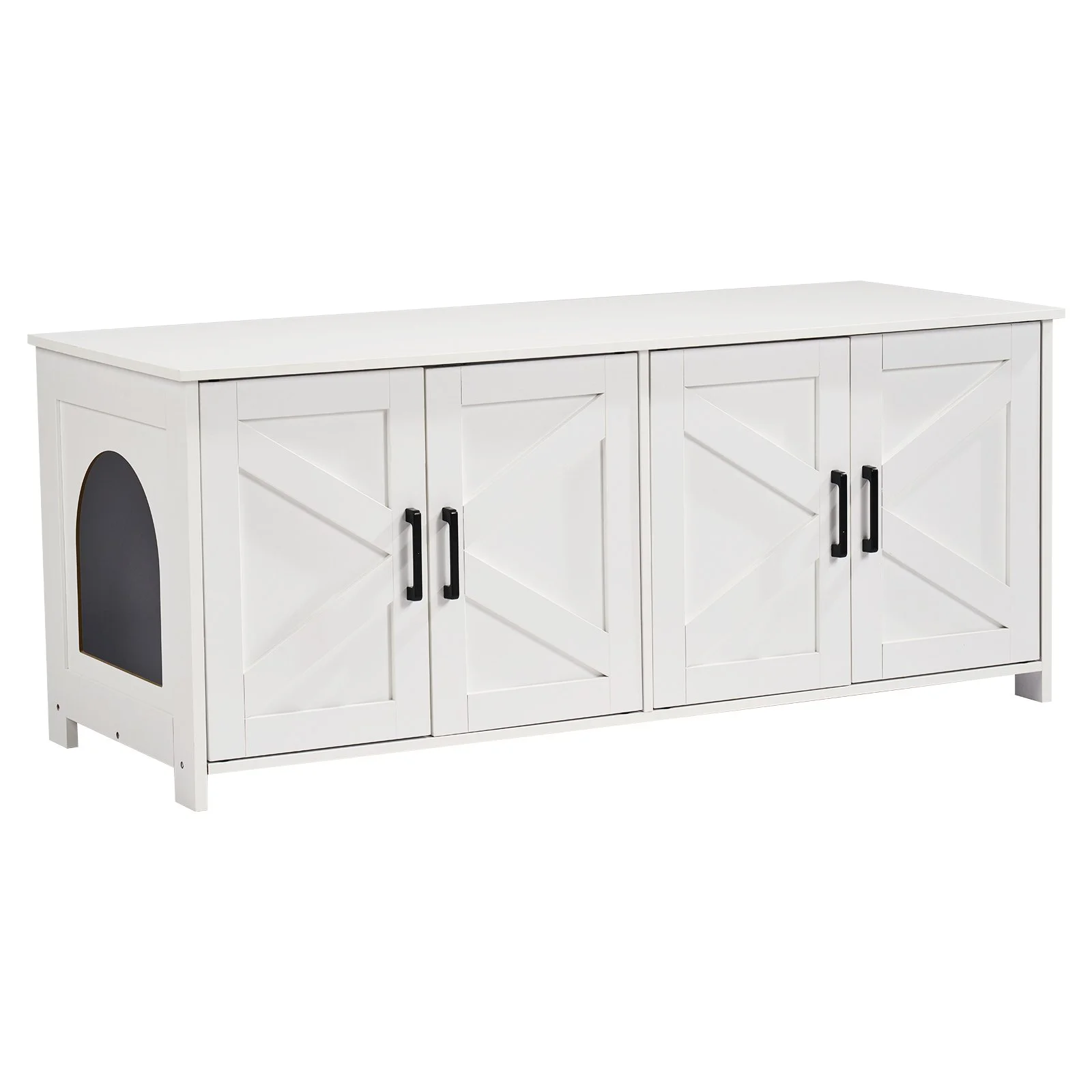 Measuring 47.2x18.5x19.7in, this cat litter box furniture provides a comfortable and free resting space for pets. It can accommodate cat litter boxes with a length of less than 21" and a width of less than 17.7". It is equipped with 4 doors and 2 windows for cats' easy access freely.