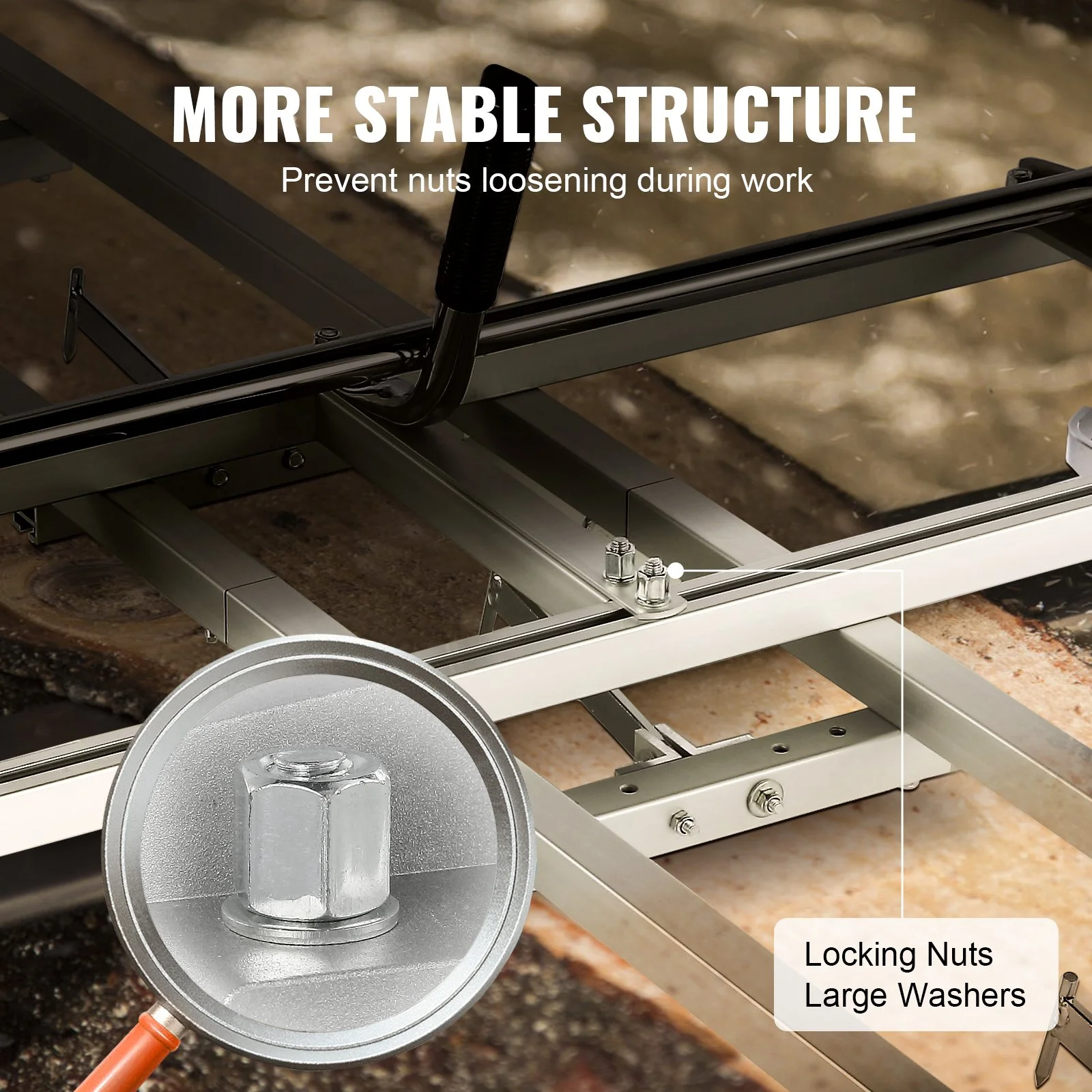 VEVOR 14"-36" chainsaw mill and 9 ft rail mill guide boast a robust and durable framework, both are secured by the connection of anti-loosening nuts and large washers. Ensure your electric chainsaw glides smoothly and steadily. Perfect for cutting wood lumber with precision and ease.