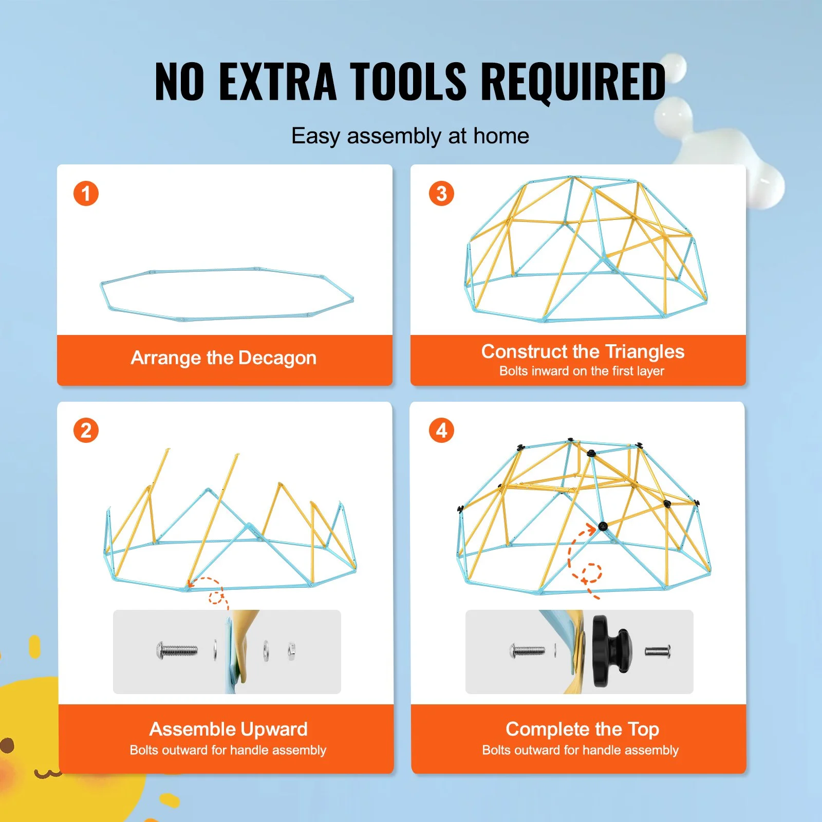 Everything you need is included, from installation tools to detailed manuals and video guides. Our clear instructions will effortlessly guide you through assembly, allowing you to quickly create a fun playground for your children with our kids climbing dome.