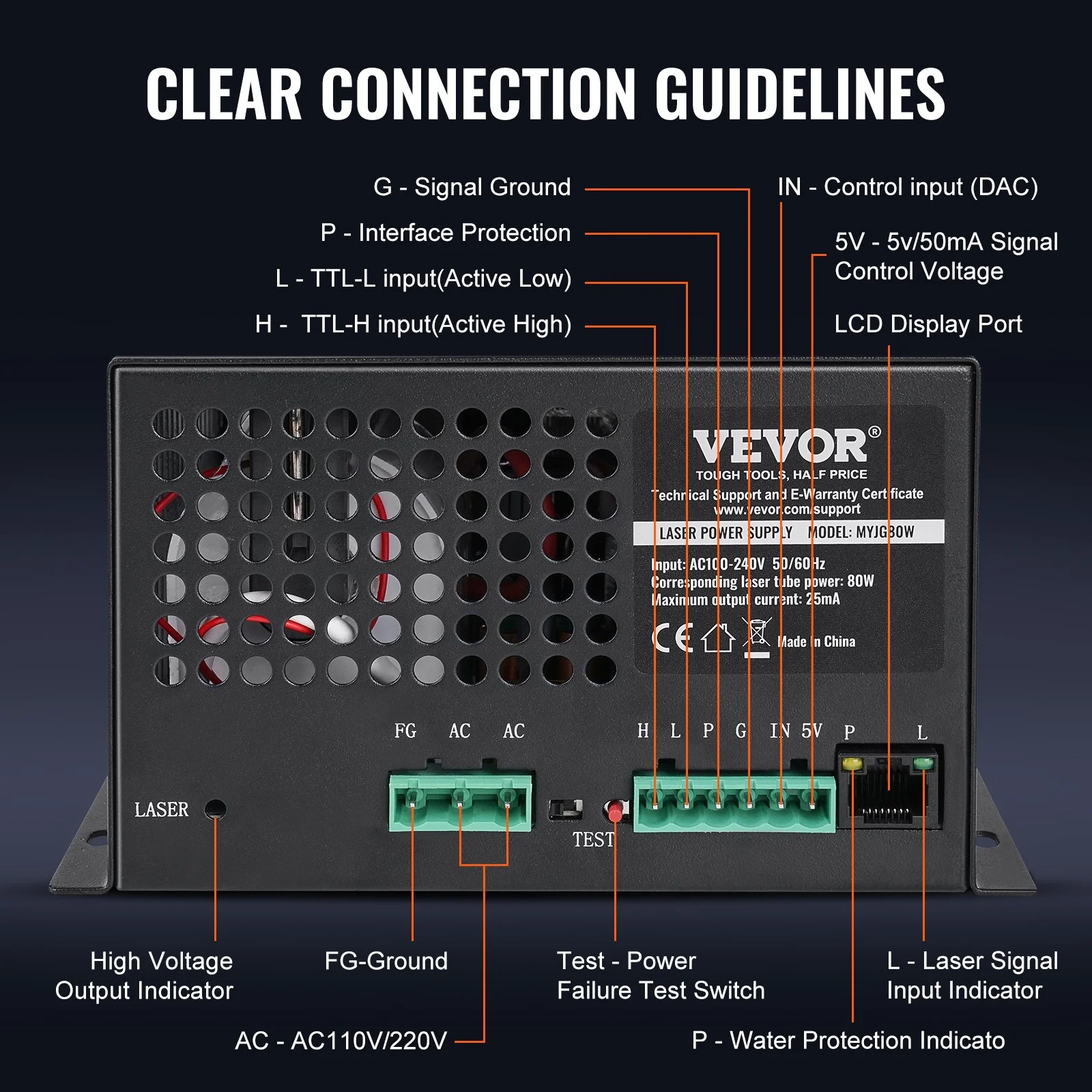 The laser power supply specially made for laser engraving machine is perfectly compatible with different brands of 80W laser tubes, the ports are clearly marked with corresponding labels, you can easily complete the connection according to the guidelines.