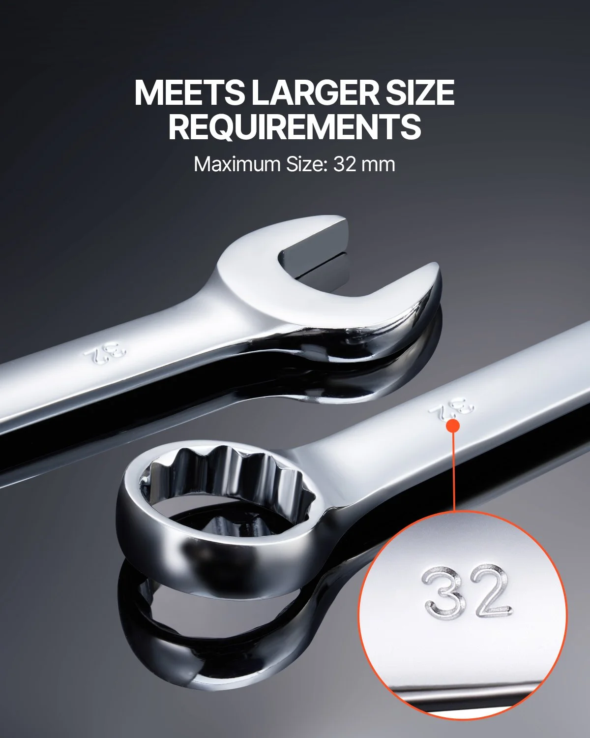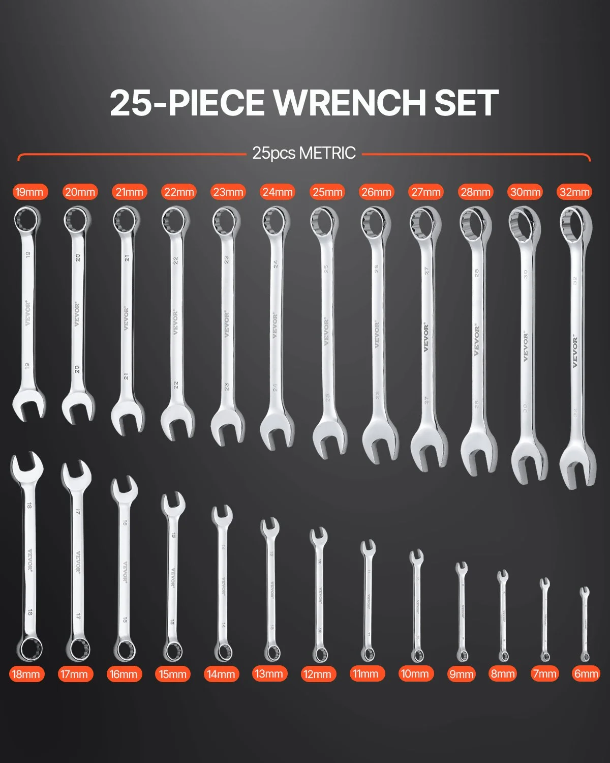 Our wrench set includes 25 metric wrenches: 6, 7, 8, 9, 10, 11, 12, 13, 14, 15, 16, 17, 18, 19, 20, 21, 22, 23, 24, 25, 26, 27, 28, 30, 32 mm.