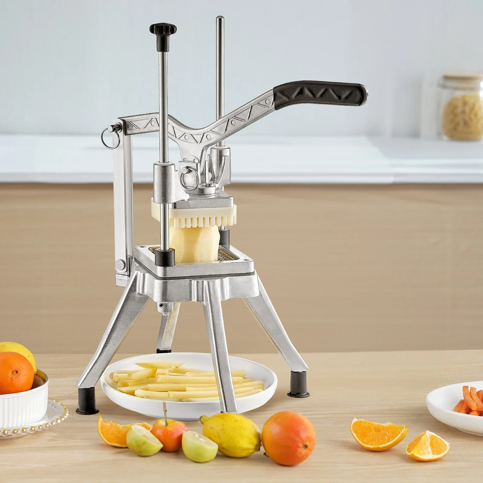 The heavy-duty chopper is very suitable for restaurants and home kitchens. It can be used to cut potatoes, carrots, cucumbers, apples, pears, and other vegetables and fruits. It is ideal for those who want to prepare vegetables and fruits for salads, French fries, and desserts conveniently and quickly.